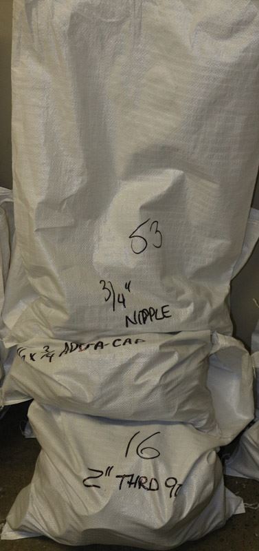 53- 3/4" NIPPLES, 39- 1 1 /2" X 3/4" ADD-A-CAP, 22- 1 1/4" X 1 1/4" X 1" CAST IRON TEE, 16- 2" X 90* THREADED ELBOW,