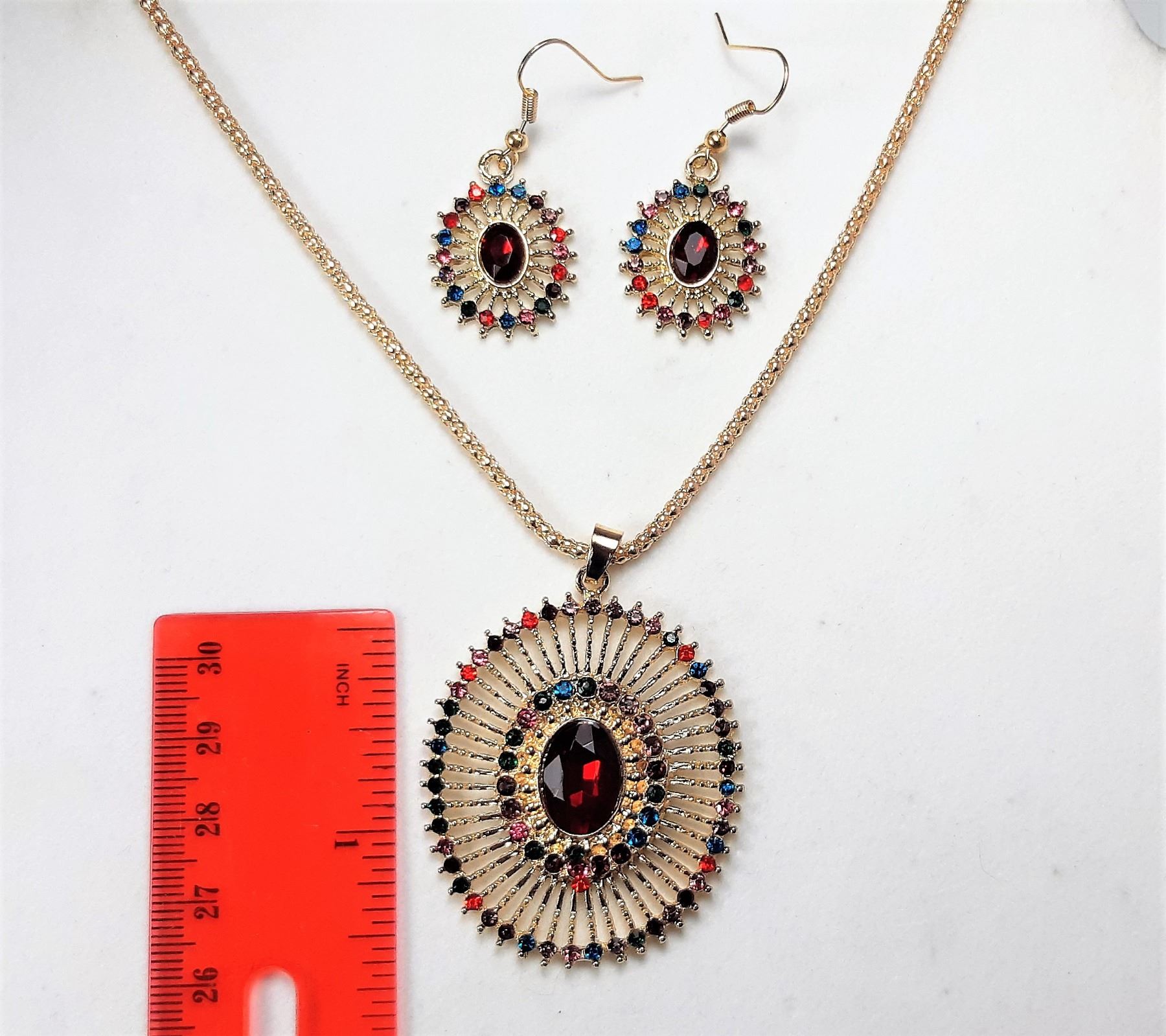 TONE ROPE CHAIN & MATCHING DROP EARRINGS FEATURING MULTI COLORED RHINESTONES. JEWELLERY