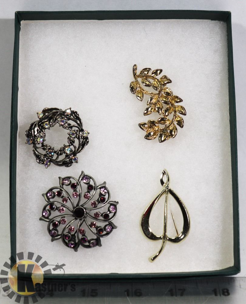 SILVER AND GOLD TONED JEWELLERY BROOCHES. ALL RHINESTONES PRESENT. BROOCHES ARE IN GREAT CONDITION. AURORA BOREALIS RHINESTONES ON CIRCLE BROOCH. - JEWELLERY