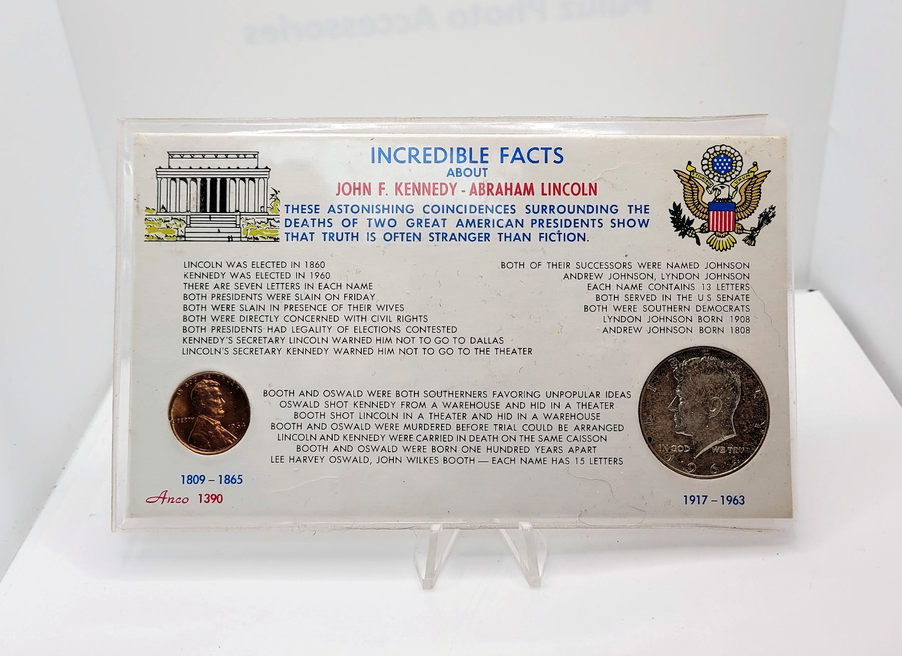 1964 US PENNY WITH FACT SHEET WITH COINCIDENCES OF THE 2 ASSASSINATED PRESIDENTS. CURRENCY
