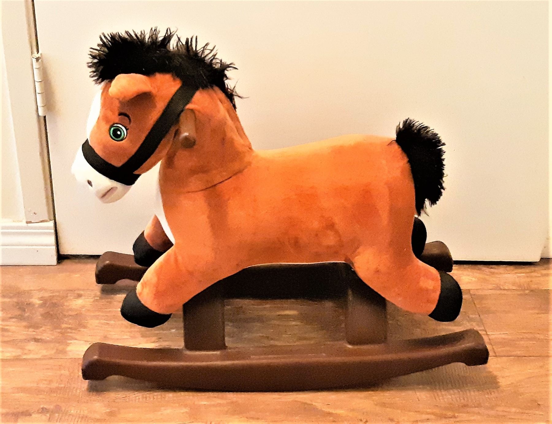 BATTERY PACK IS IN THE NECK BY THE MANE, 22" IN LENGTH AND 13" IN HEIGHT FROM GROUND TO BACK, BUT HAS ADJUSTABLE HEIGHT WITH INSTRUCTIONS ON THE BASE BY HIS TAIL..TOYS