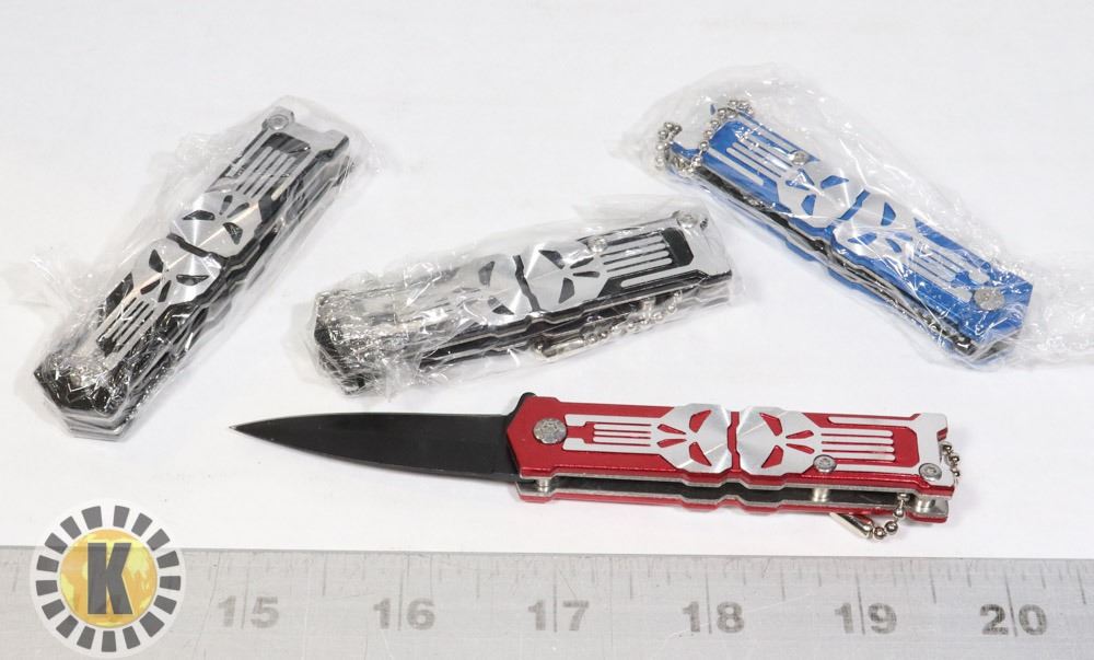4 NEW MINI SKULL KNIVES - 2 BLACK, 1 BLUE, 1 RED