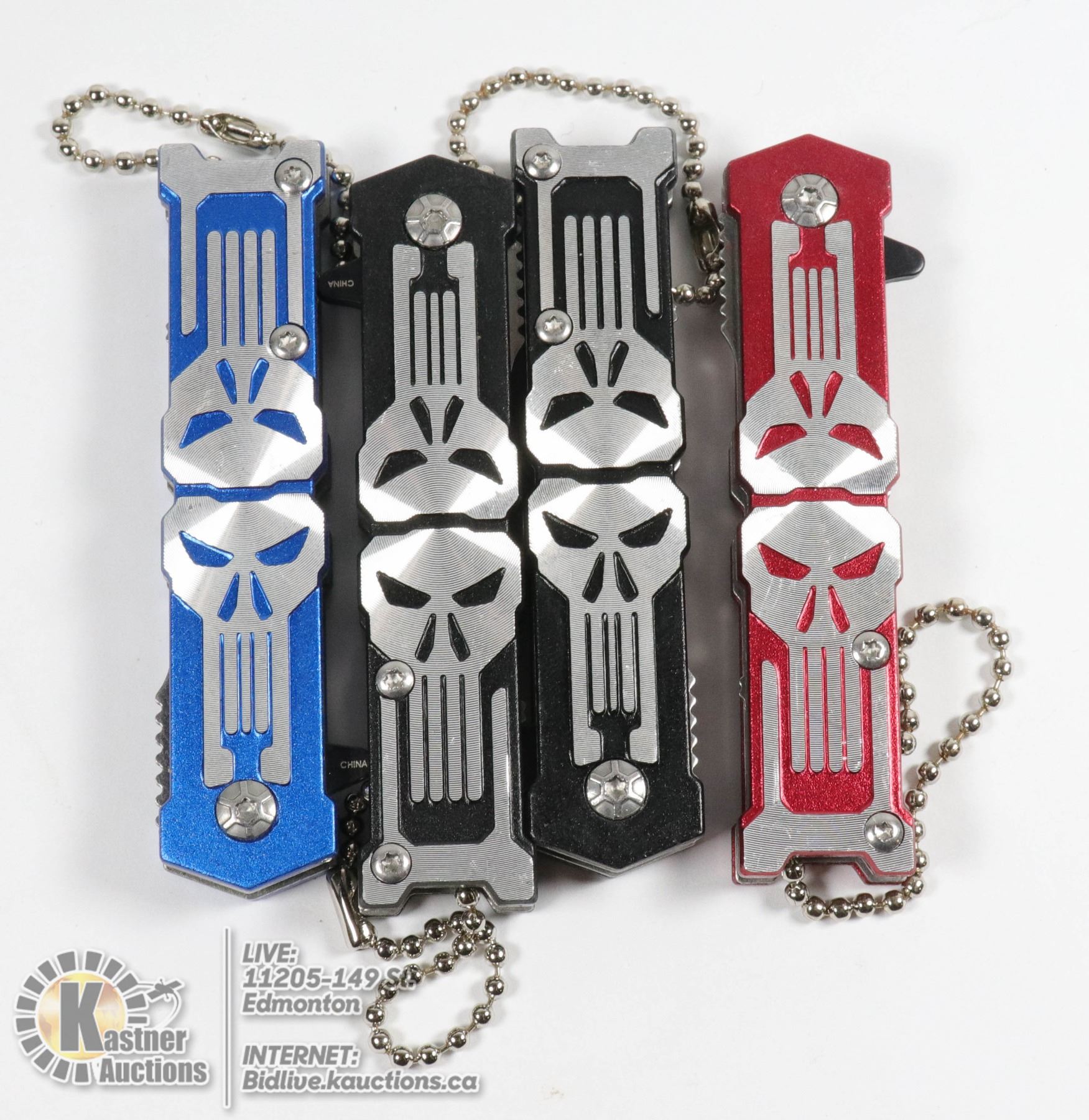 4 NEW MINI SKULL KNIVES - 2 BLACK, 1 RED, 1 BLUE