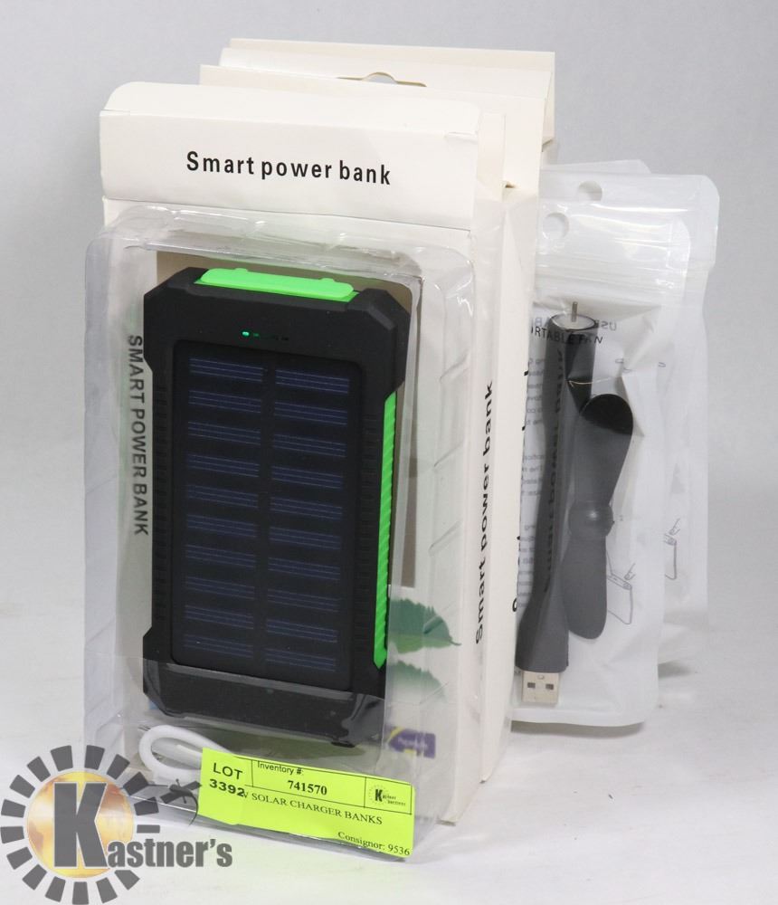 ONE ORANGE, BLUE, GREEN AND BLACK CHARGER. EMERGENCY LED LIGHT, SHOCK PROOF, WATER RESISTANT, DUAL USB CHARGING PORTS. LI-POLYMER, COMPATIBLE WITH CELL PHONES, GPS, CAMERA, VAPES ETC. INCLUDES USB FAN AND USB CABLE.