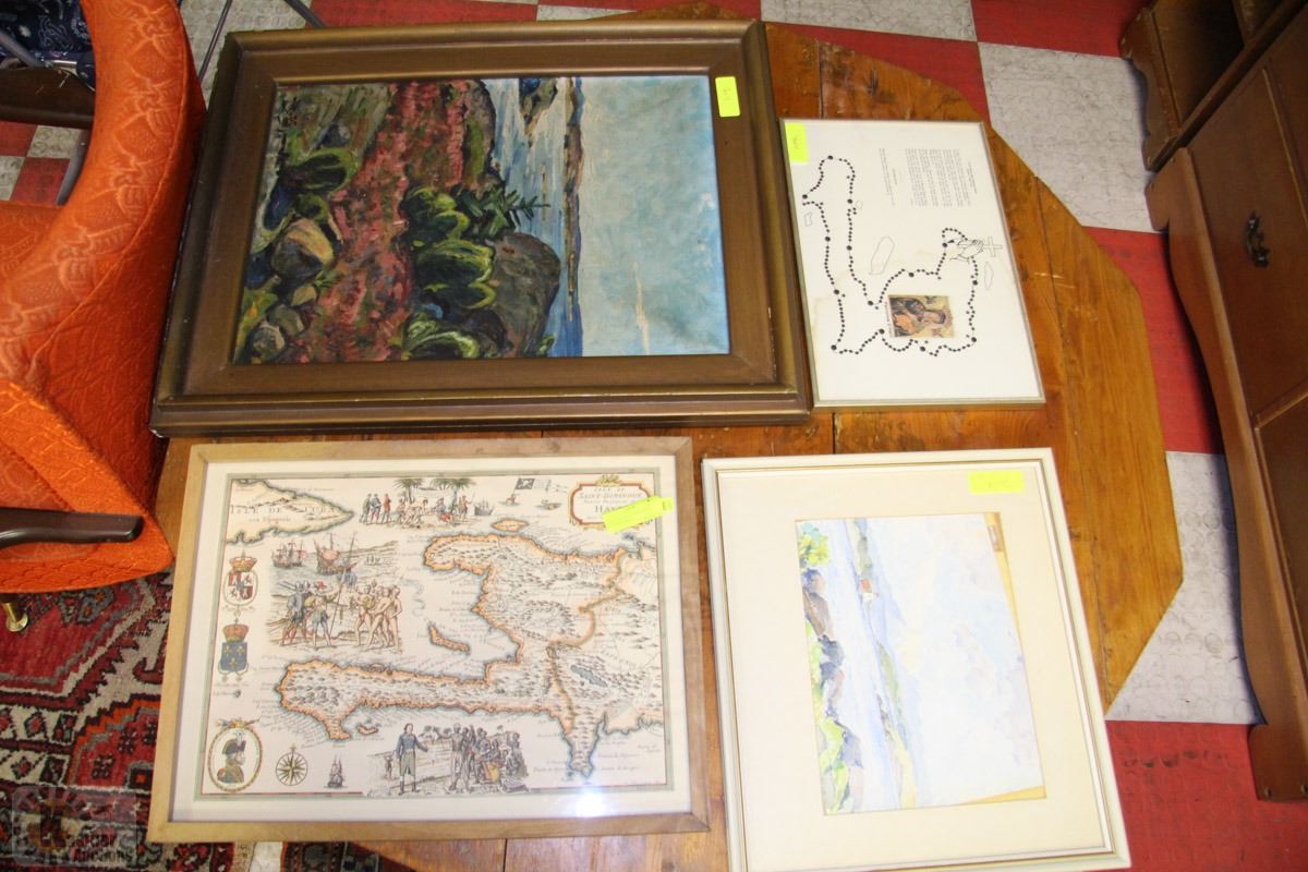 C.CUNNINGHAM 1977 WOODEN FRAMED OIL ON CANVAS PICTURE, ISLE DE SAINT DOMINGUE PARTIE FRANCOISE OU HAYTI 1789 MAP FRAMED AND MORE