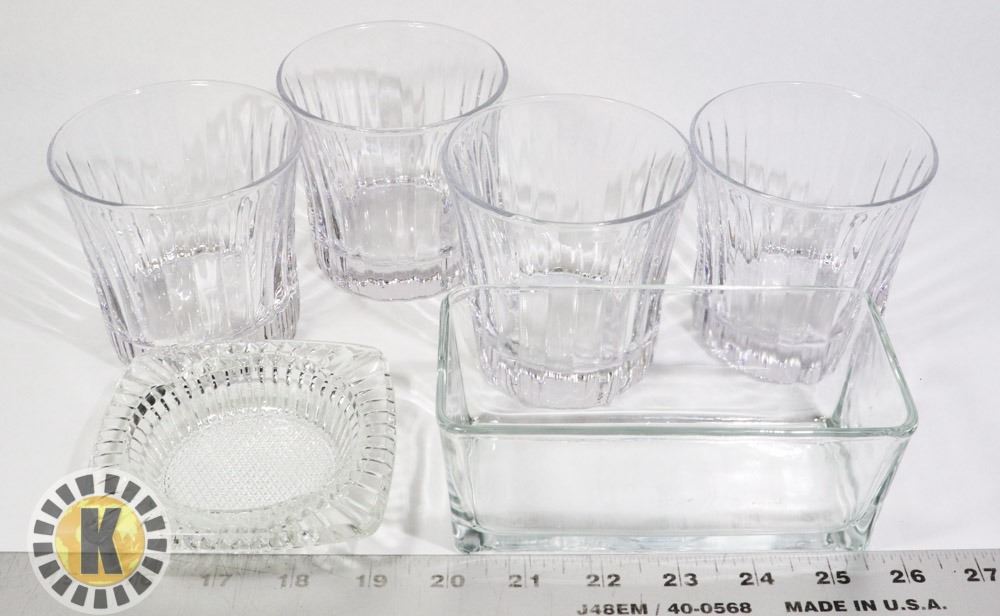 4 SHORT GLASSES, GLASS ASH TRAY AND DISH