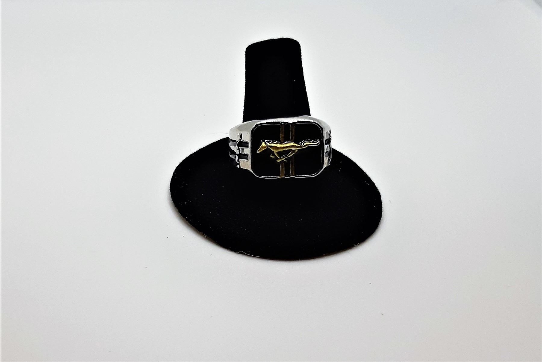 GOLD TONE ACCENT FORD MUSTANG INSIGNIA RING, SIZE 10. JEWELRY