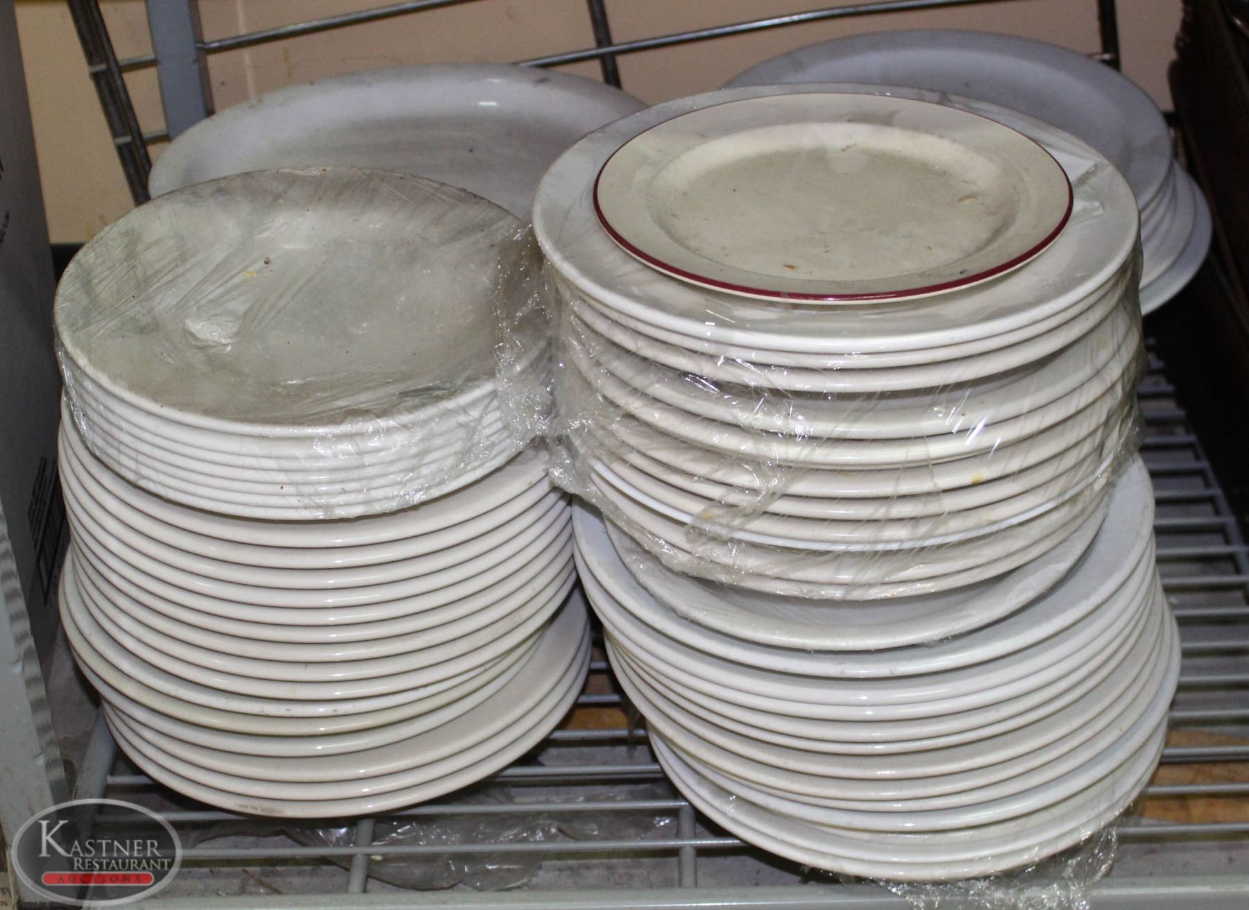 4 STACKS OF ASSORTED DISHWARE INCL. PLATES & BOWLS