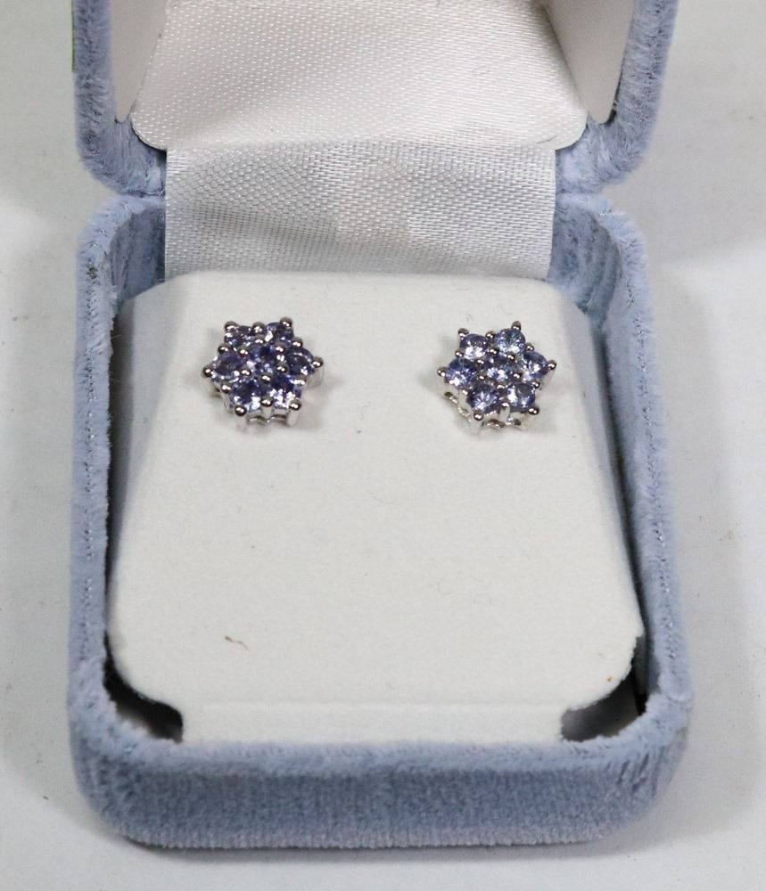 4 - JP294 - STERLING SILVER TANZANITE FLOWER SHAPED EARRINGS. JEWELLERY