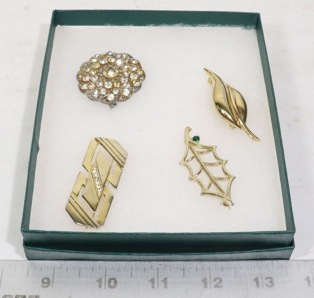 GOLD TONED JEWELRY BROOCHES. ALL RHINESTONES PRESENT. CLASPS WORK - JEWELRY