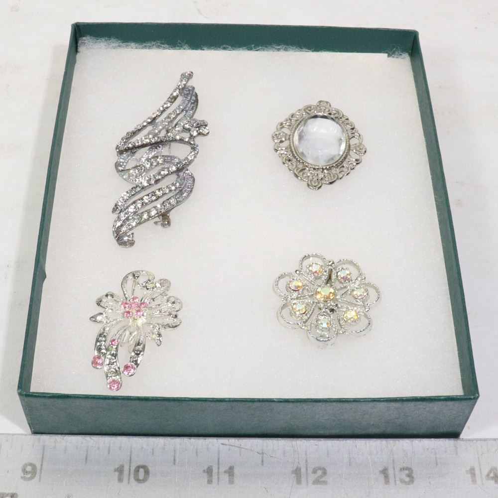 SILVER TONED JEWELRY BROOCHES. ALL RHINESTONES PRESENT. CLASPS WORK -JEWELRY