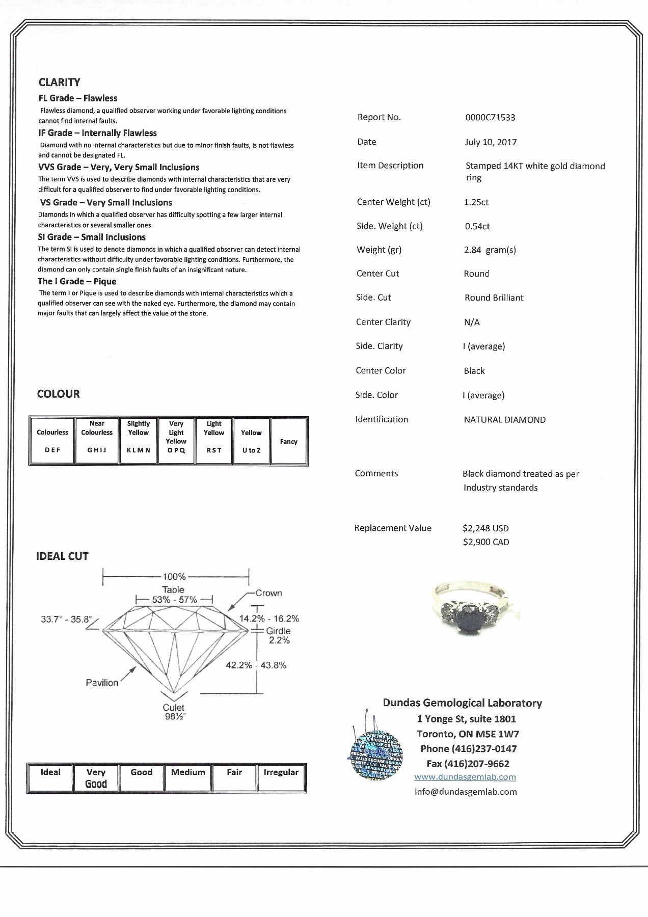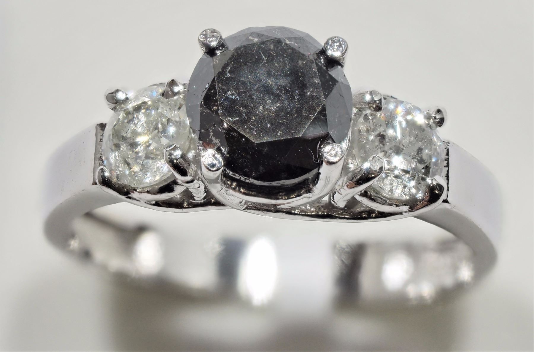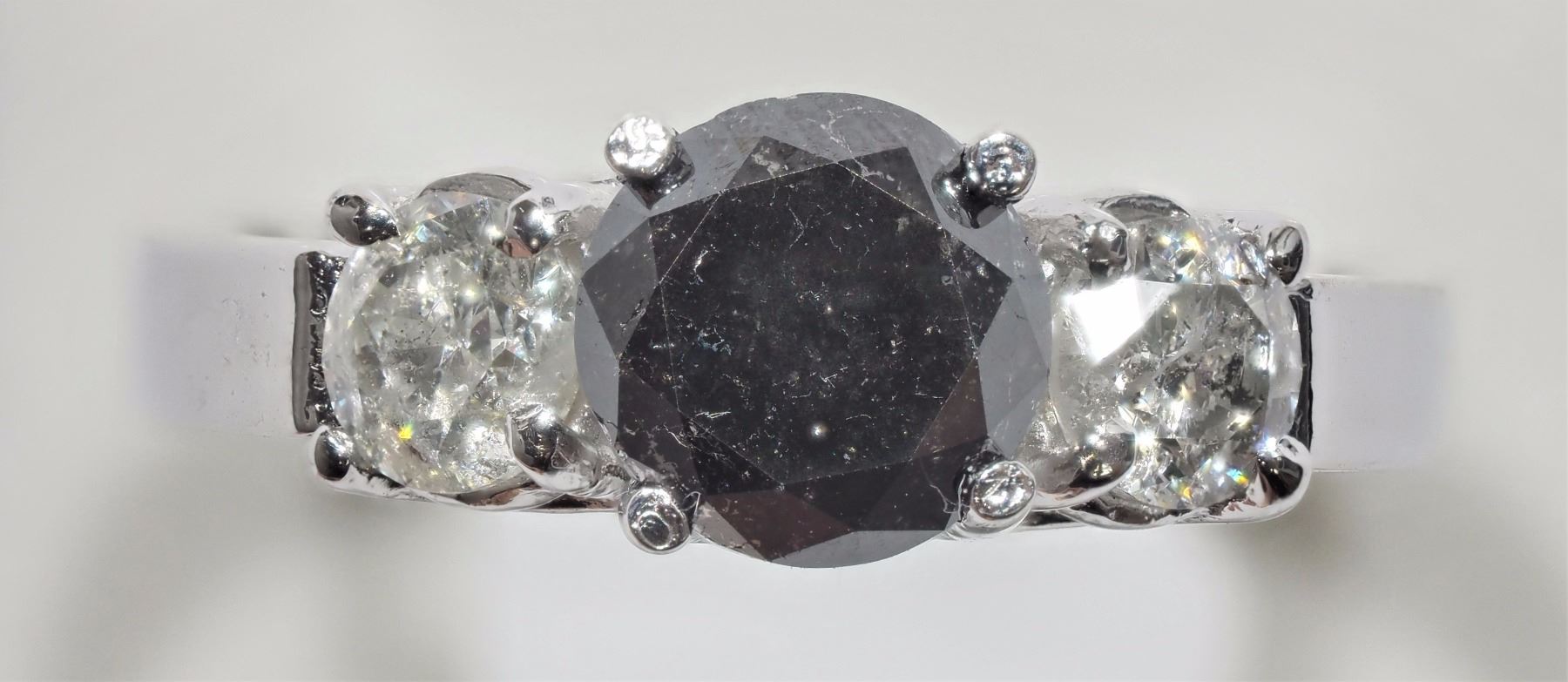 40-NT58- 14K WHITE GOLD BLACK (1.25CT) AND 2 WHITE (0.54CT) DIAMOND RING SIZE 6 W/COA. SUGGESTED REPLACEMENT VALUE $2900.00. JEWELLERY