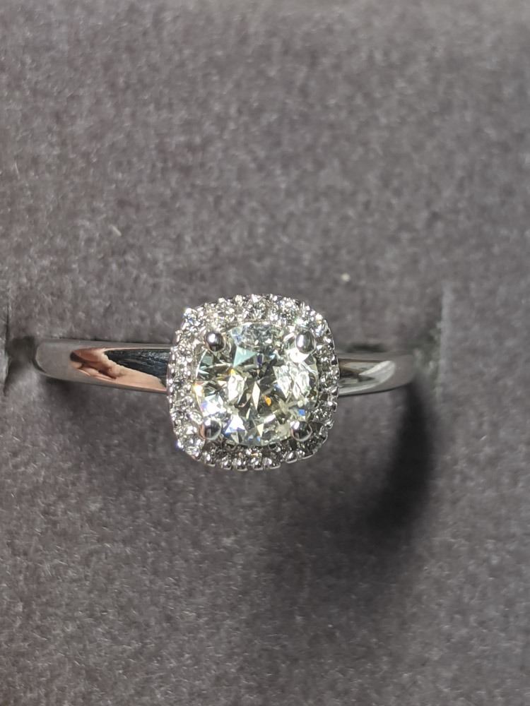 ROUND BRILLIANT CUT DIAMOND (MEASURING 5.35 - 5.37MM, CLARITY GRADE I-2, COLOUR GRADE G, CUT GRADE GOOD, WEIGHS 0.60 CARATS) SURROUNDED BY 16 ROUND BRILLIANT CUT DIAMONDS (MEASURING 1.10MM, CLARITY GRADE SI 1-2, COOUR GRADE G-H, WEIGHING0.10 CARATS). COMES WITH CERTIFICATE OF APPRAISAL FROM LOCAL APPRAISER. SUGGESTED INSURANCE COVERAGE $3,600.00. JEWELLERY