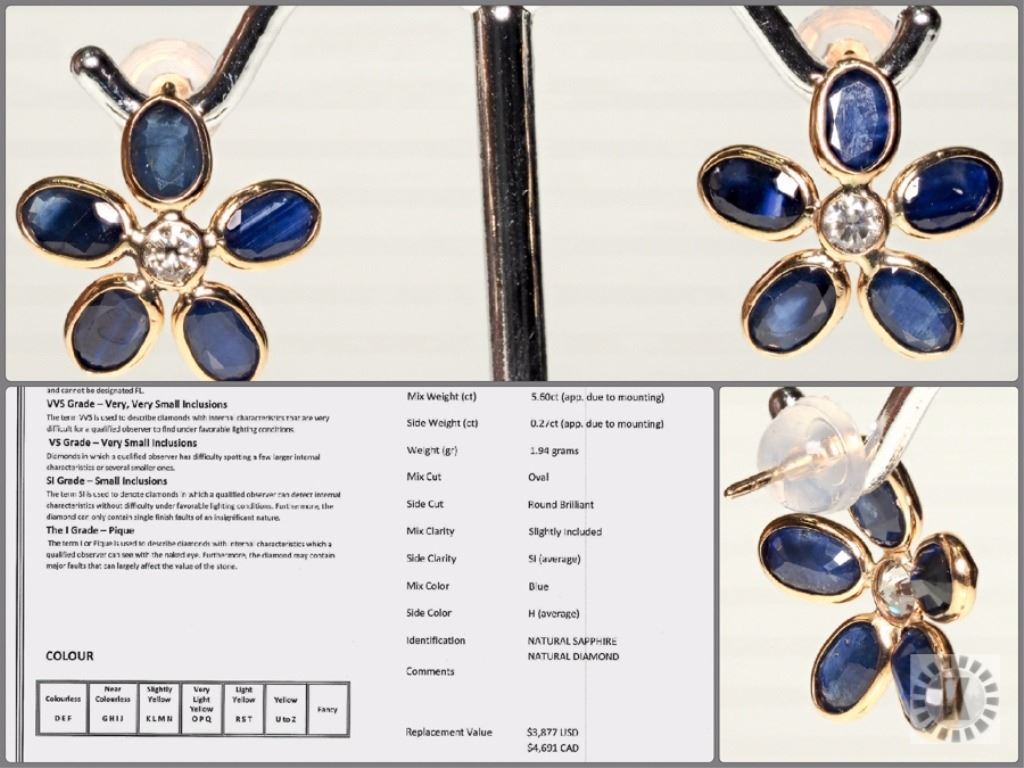 14K YELLOW GOLD SAPPHIRE (5.60CT) AND DIAMOND (0.27CT) FLOWER EARRINGS - SUGGESTED REPLACEMENT VALUE $4,691.00