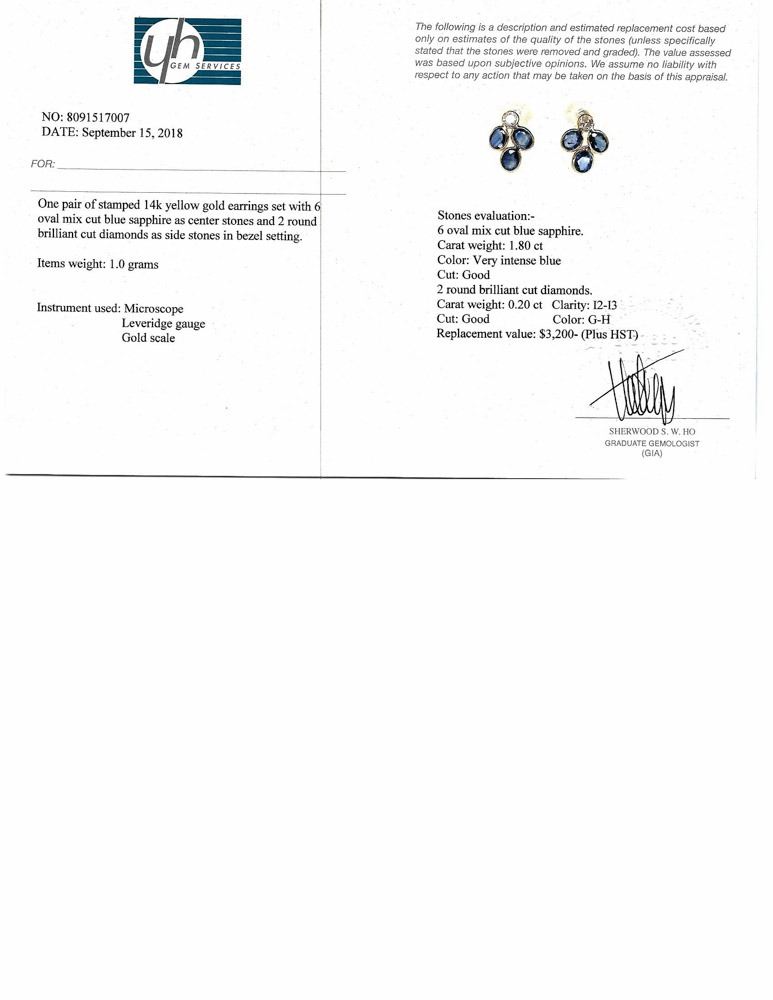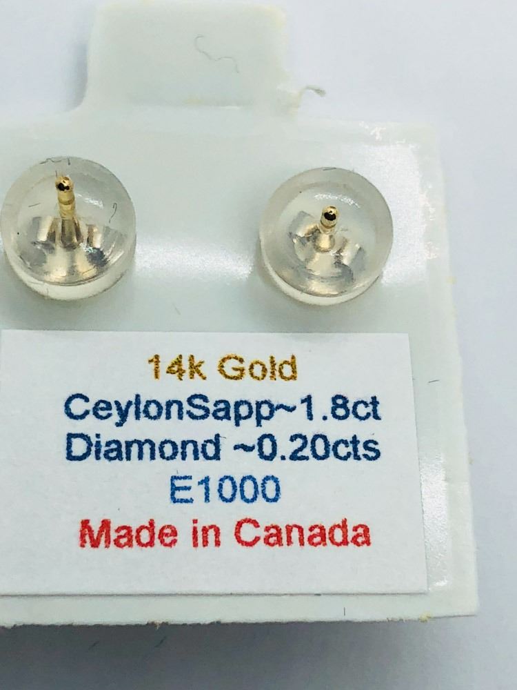 90 - JP263 - 14K YELLOW GOLD CEYLON SAPPHIRE (1.8CTS) DIAMOND (0.2CTS.) EARRINGS, MADE IN CANADA W/COA, APPRAISAL NOT FROM A LOCAL VERIFIED APPRAISER. SUGGESTED REPLACEMENT VALUE $3200.00. JEWELLERY