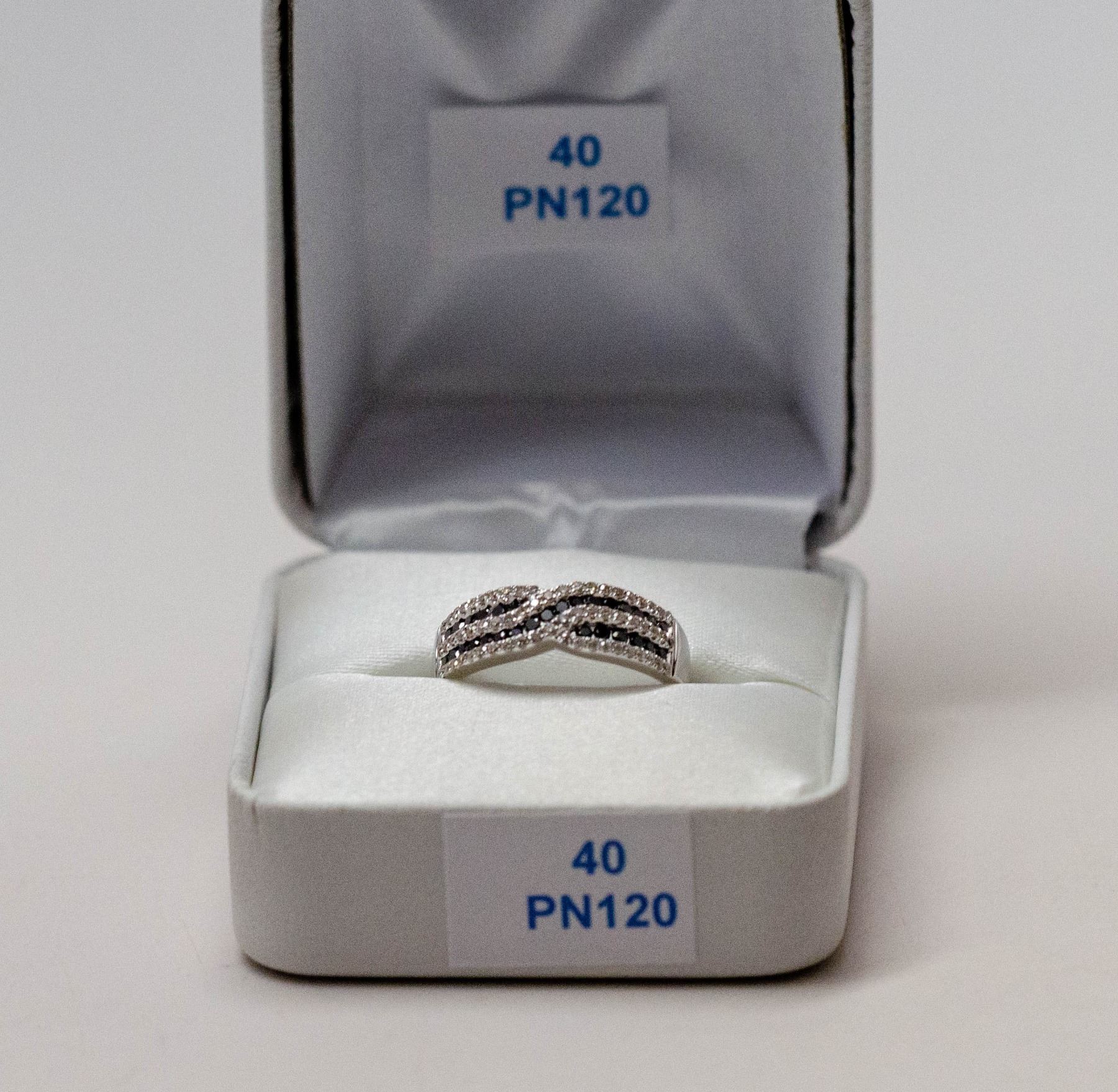 RING SIZE 7. THE BRIGHT POLISHED BRAID DESIGN MOUNT IS SET WITH 29 ROUND BRILLIANT CUT FANCY COLOURED BLACK LABORATORY COLOUR ENHANCED DIAMONDS (MEASURING 1.40 MM, WEIGHING IN TOTAL 0.40 CARAT) AND 62 ROUND BRILLIANT CUT DIAMONDS (MEASURING1.00 - 1.10 MM, CLARITY GRADE I 1-2, COLOR GRADE H-I, WEIGHING IN TOTAL 0.35 CARAT. COMES WITH CERTIFICATE OF APPRAISAL FROM LOCAL APPRAISER, SUGGESTED INSURANCE COVERAGE $1200.00. JEWELLERY
