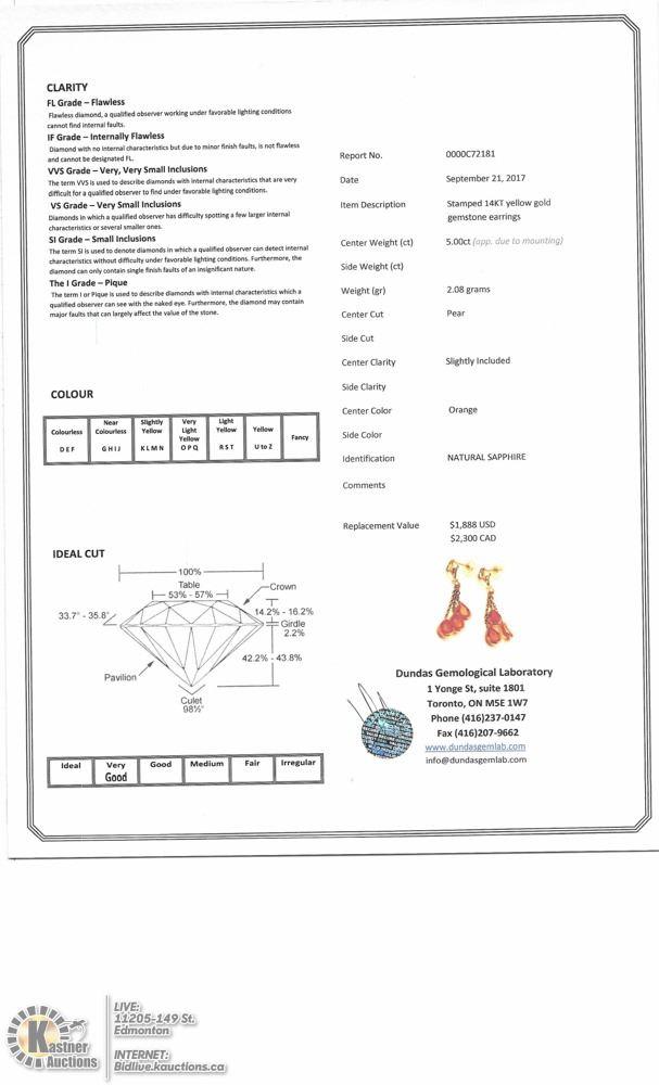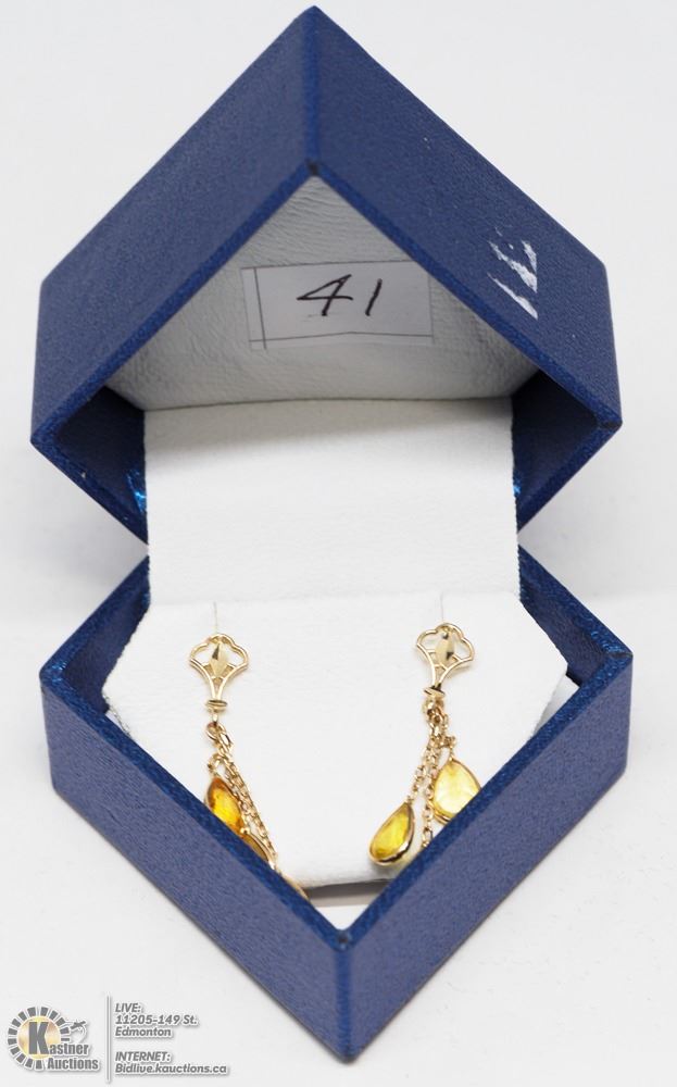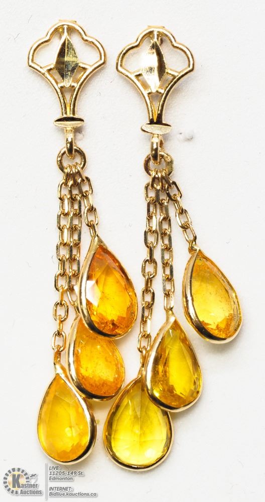 41-LS23- 14KT GOLD WITH YELLOW AND ORANGE SAPPHIRES (5CT) IN CHANDELIER STYLE EARRINGS. SUGGESTED REPLACEMENT VALUE $2300.00. JEWELLERY