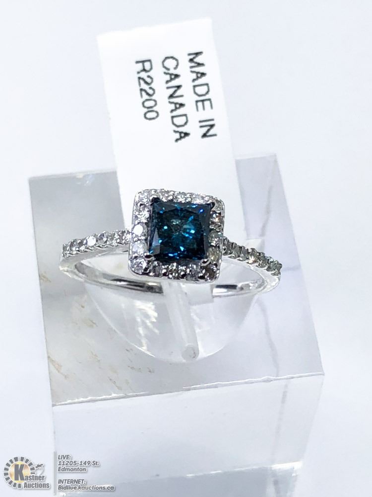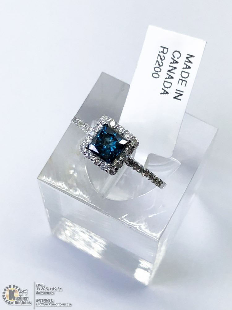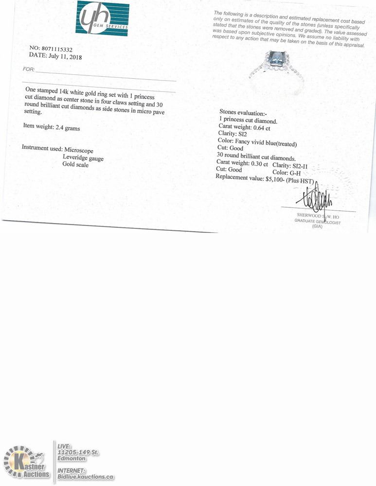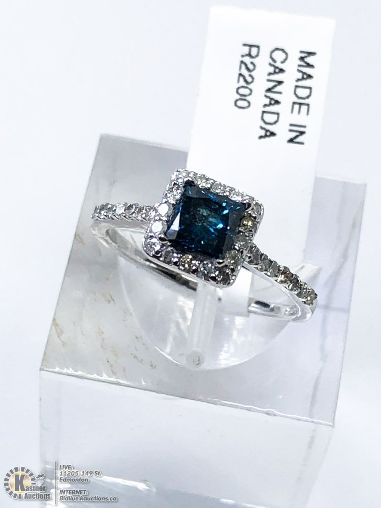 91-LS112 - 14KT WHITE GOLD BLUE DIAMOND (0.64CT) W/ SIDE DIAMONDS (0.30CT) RING (SIZE 6.5). SUGGESTED REPLACEMENT VALUE $5100.00. JEWELLERY