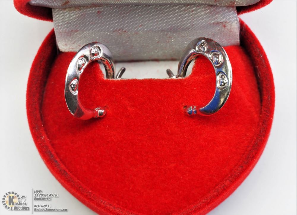41 - MS3- STERLING SILVER HOOP STYLE EARRINGS WITH HEART DESIGN. JEWELRY