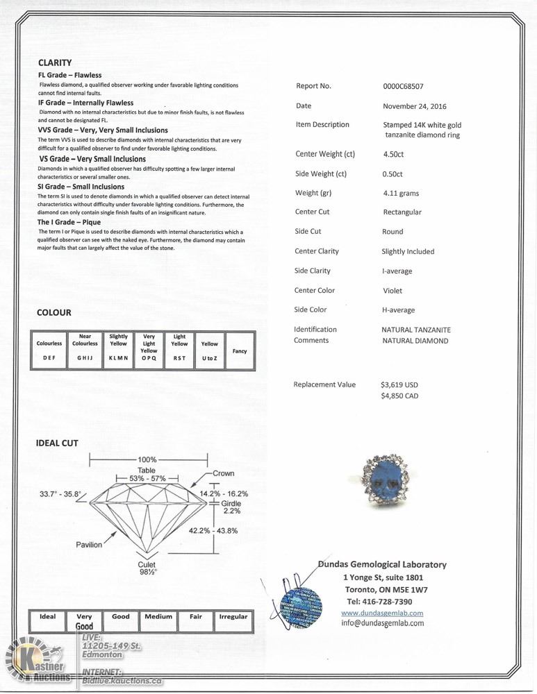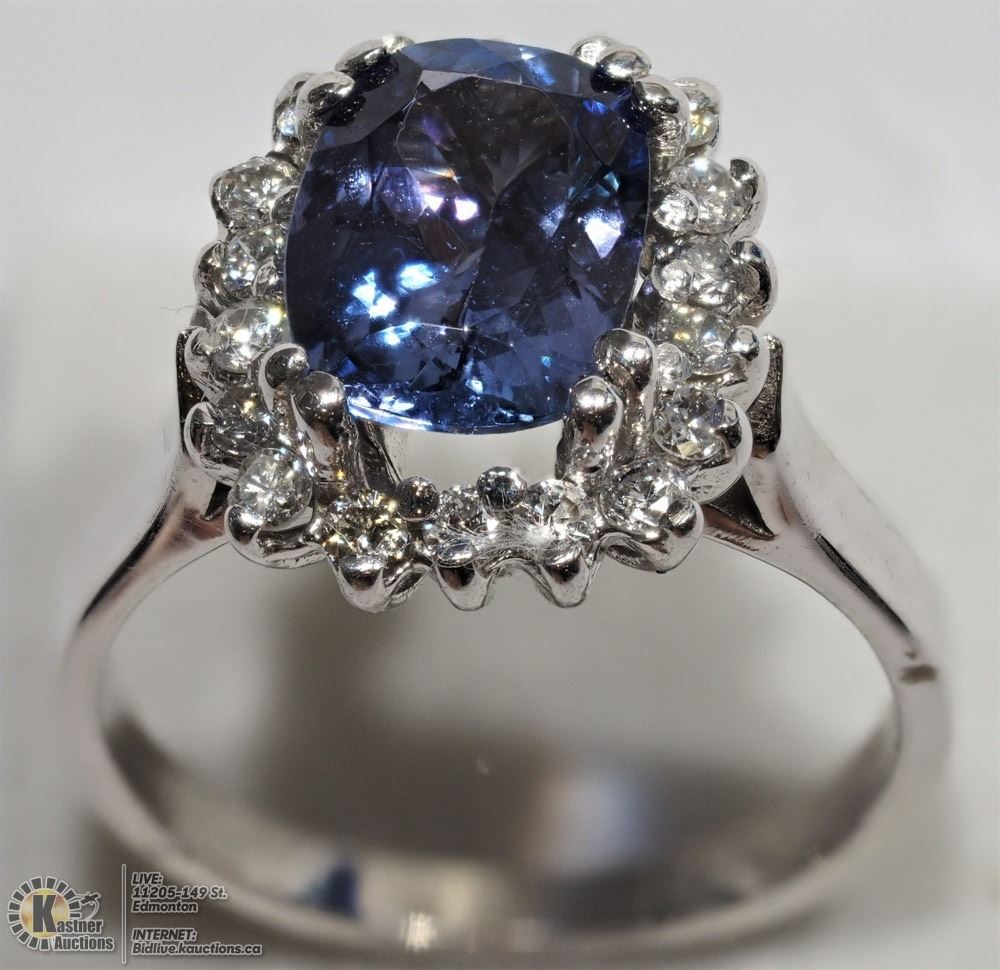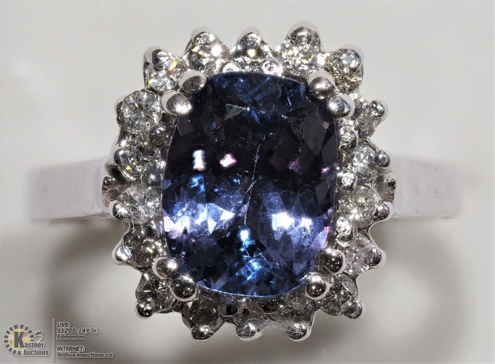 42 - MM86 - 14K WHITE GOLD TANZANITE (4.50CT) AND DIAMOND (0.50CT) HALO RING SIZE 6 W/COA. SUGGESTED REPLACEMENT VALUE $4850.00. JEWELLERY