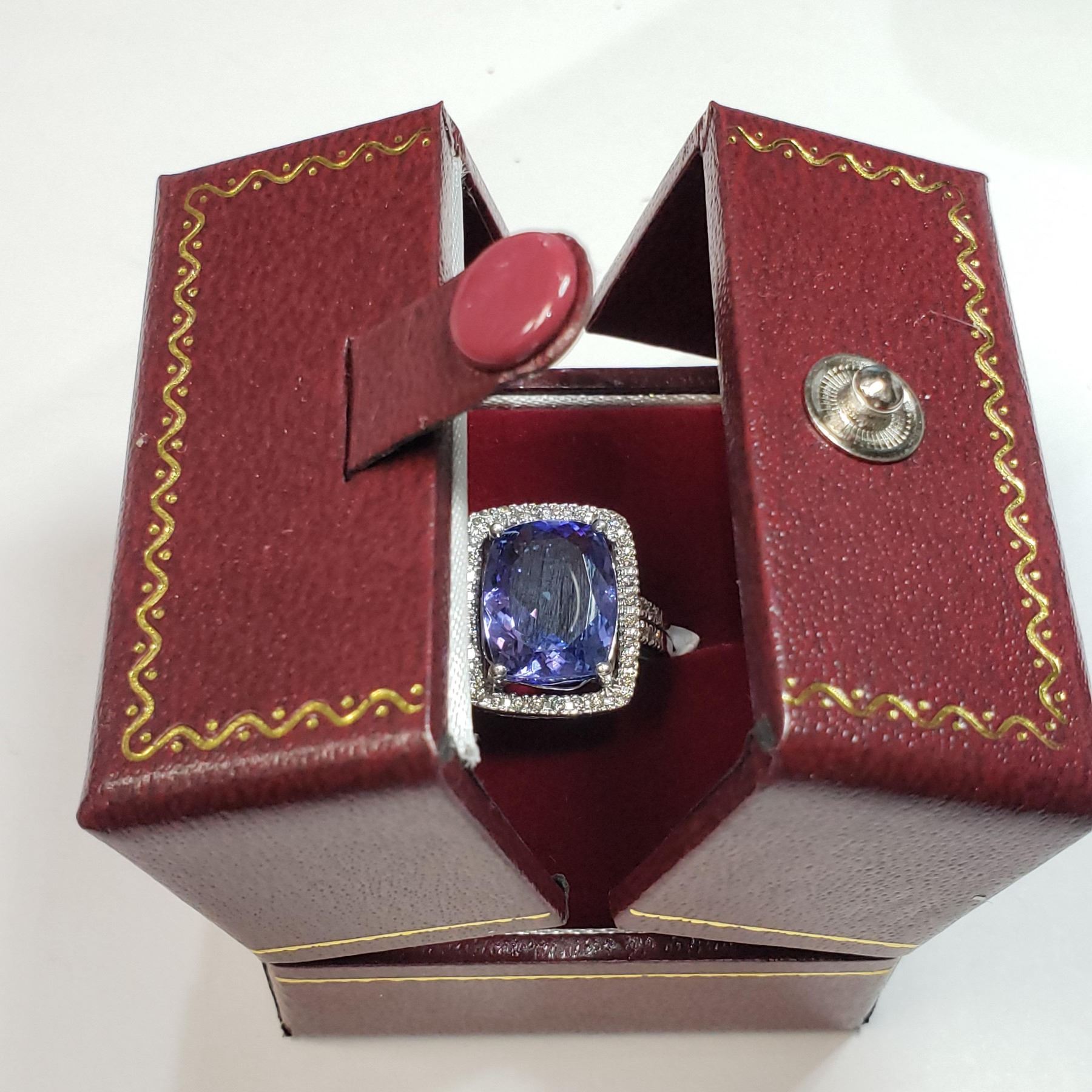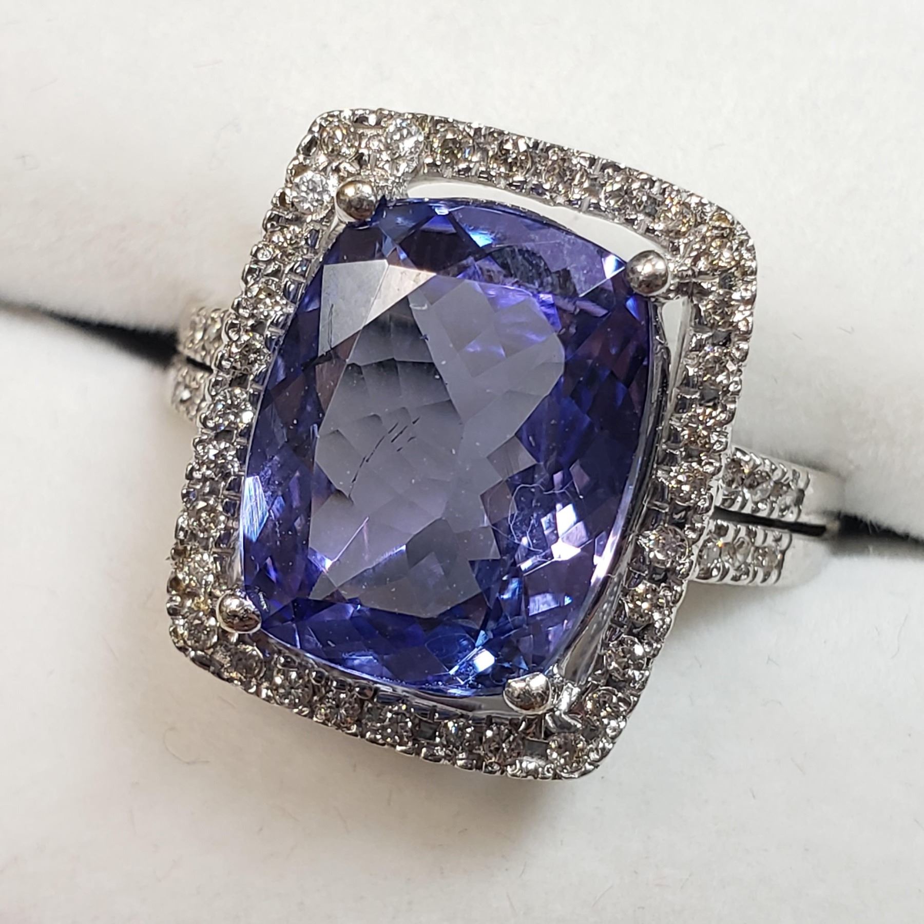 SIZE 7.25, ONE CUSHION SHAPED NATURAL TANZANITE (MEASURING 12.95 - 10.40 X 6.38 MM, TONE MEDIUM LIGHT, HUE VIOLET/BLUE, CLARITY VS-1, WEIGHING 7.63 CARATS). 44 ROUND BRILLIANT CUT DIAMONDS (MEASURING 1.10MM, CLARITY GRADE I-1, COLOR GRADE I-J, WEIGHING 0.30 CARATS. COMES WITH CERTIFICATE OF APPRAISAL FROM LOCAL APPRAISER. SUGGESTED INSURANCE COVERAGE $10,000.00. JEWELLERY