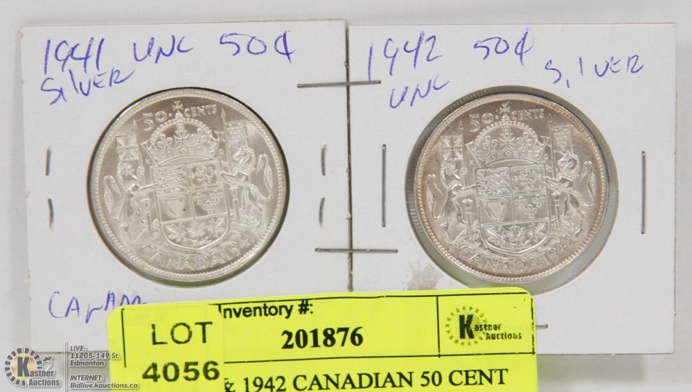 42) 1941 & 1942 CANADIAN 50 CENT SILVER COINS.