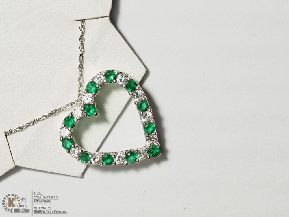 42-JP64 - STERLING SILVER SIMULATED EMERALD HEART SHAPED PENDANT NECKLACE. JEWELRY.