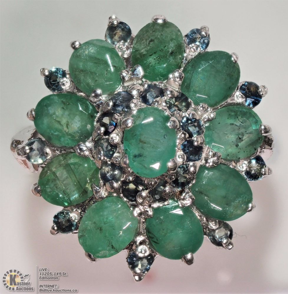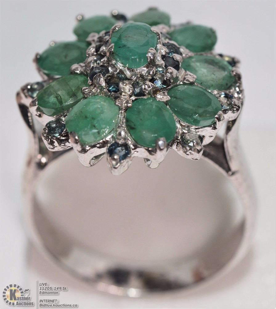 (8-NT-42)STERLING SILVER EMERALD AND SAPPHIRE FLOWER DESIGN RING SIZE:8.5