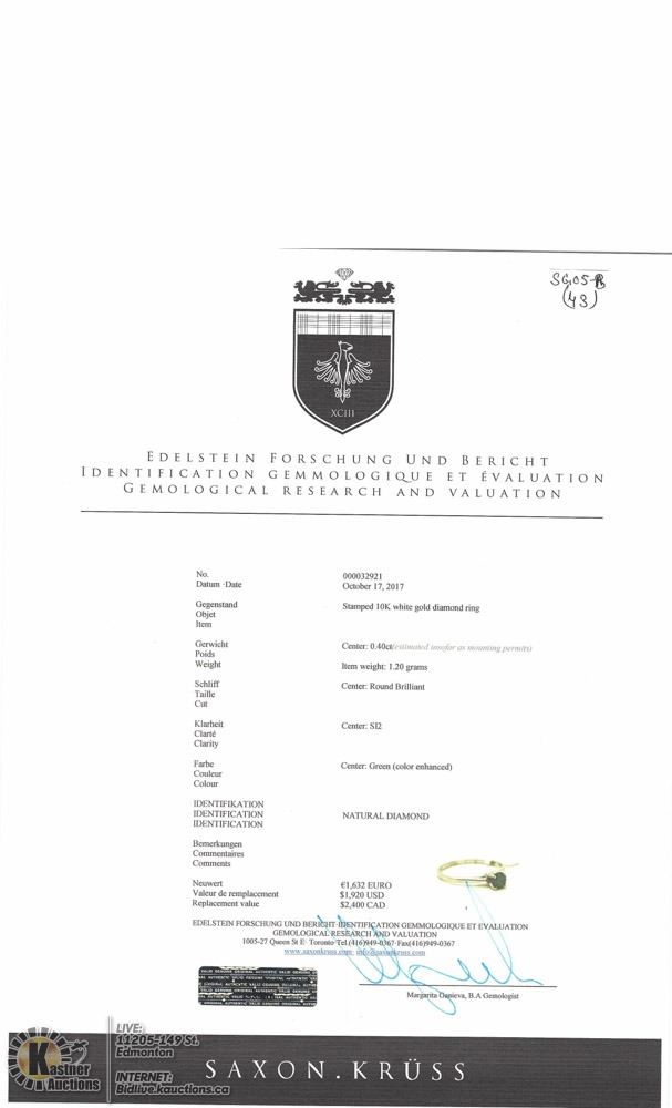 43 - MM86 - 10K WHITE GOLD GREEN DIAMOND RING SIZE 7 W/COA. SUGGESTED REPLACEMENT VALUE $2400.00. JEWELLERY