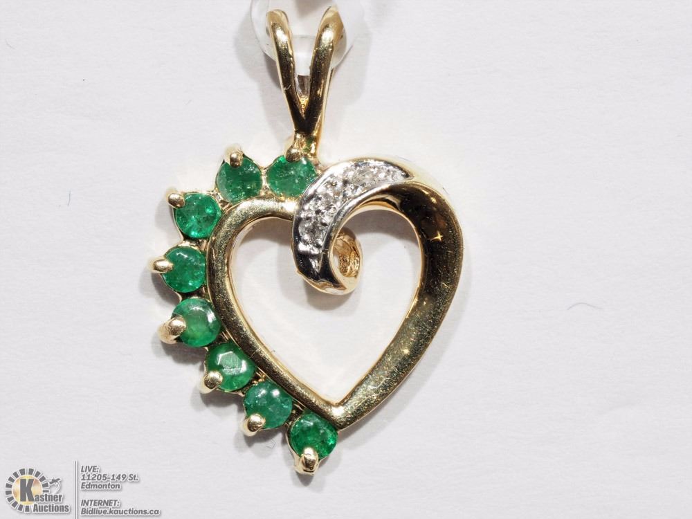 43 - GS15: 10KT YELLOW GOLD EMERALD (0.35CT) & DIAMOND APPROX. 1.43G HEART SHAPE PENDANT MSRP $1,200.00
