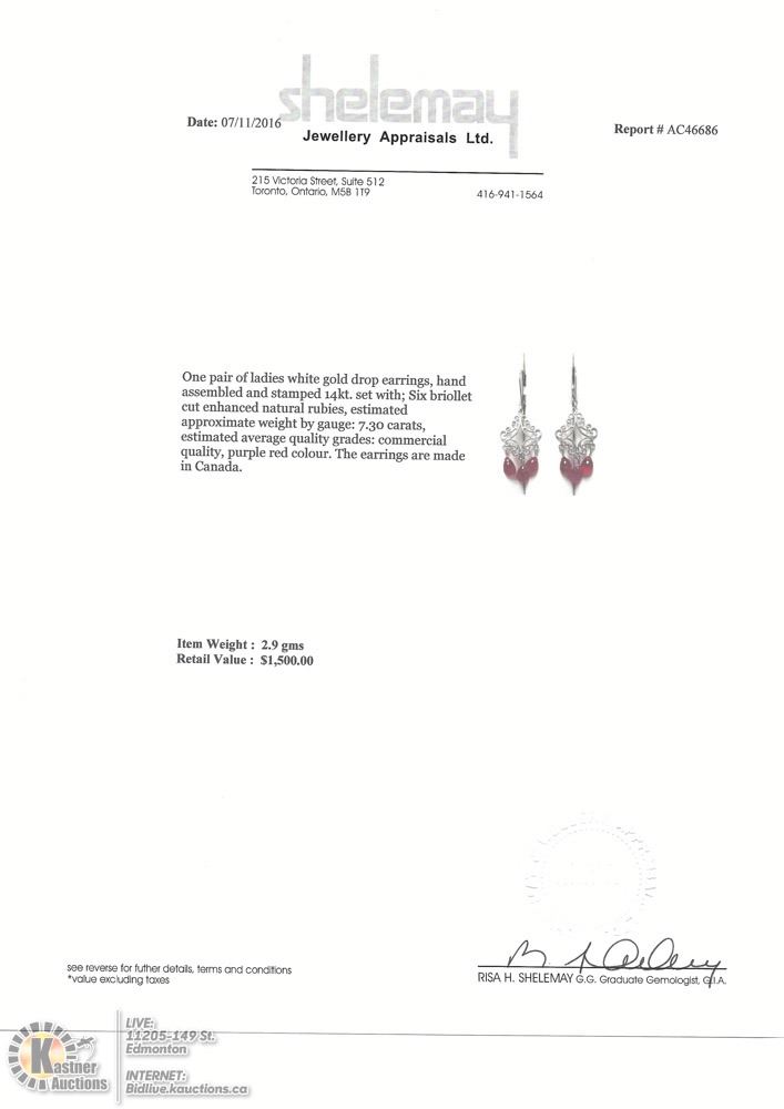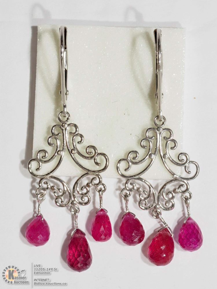 43-NT25- 14K WHITE GOLD RUBY (7.3CT) ANTIQUE STYLE EARRINGS. W/COA. SUGGESTED REPLACEMENT VALUE $1500.00