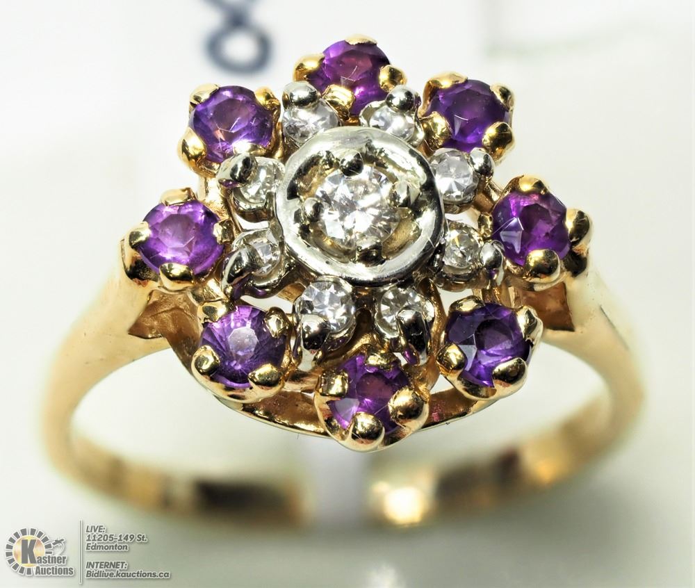 44-LS23- 10KT GOLD DIAMOND (.15CT) AND AMETHYST (.4CT) RING SIZE 6.25. SUGGESTED REPLACEMENT VALUE $2025.00. JEWELLERY