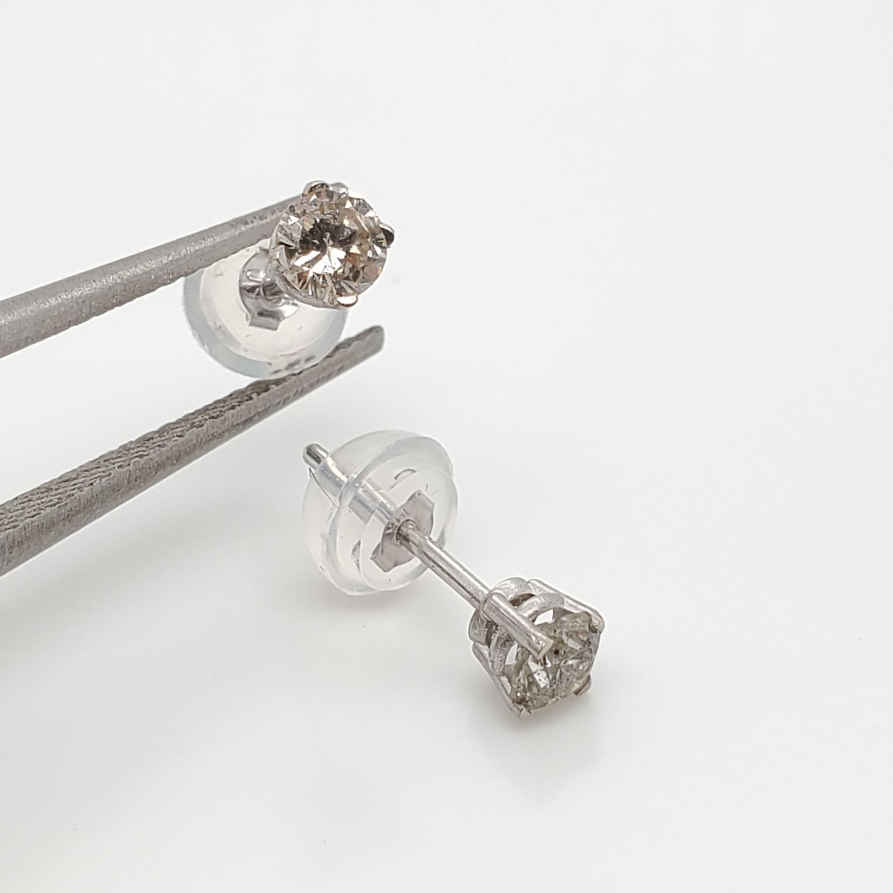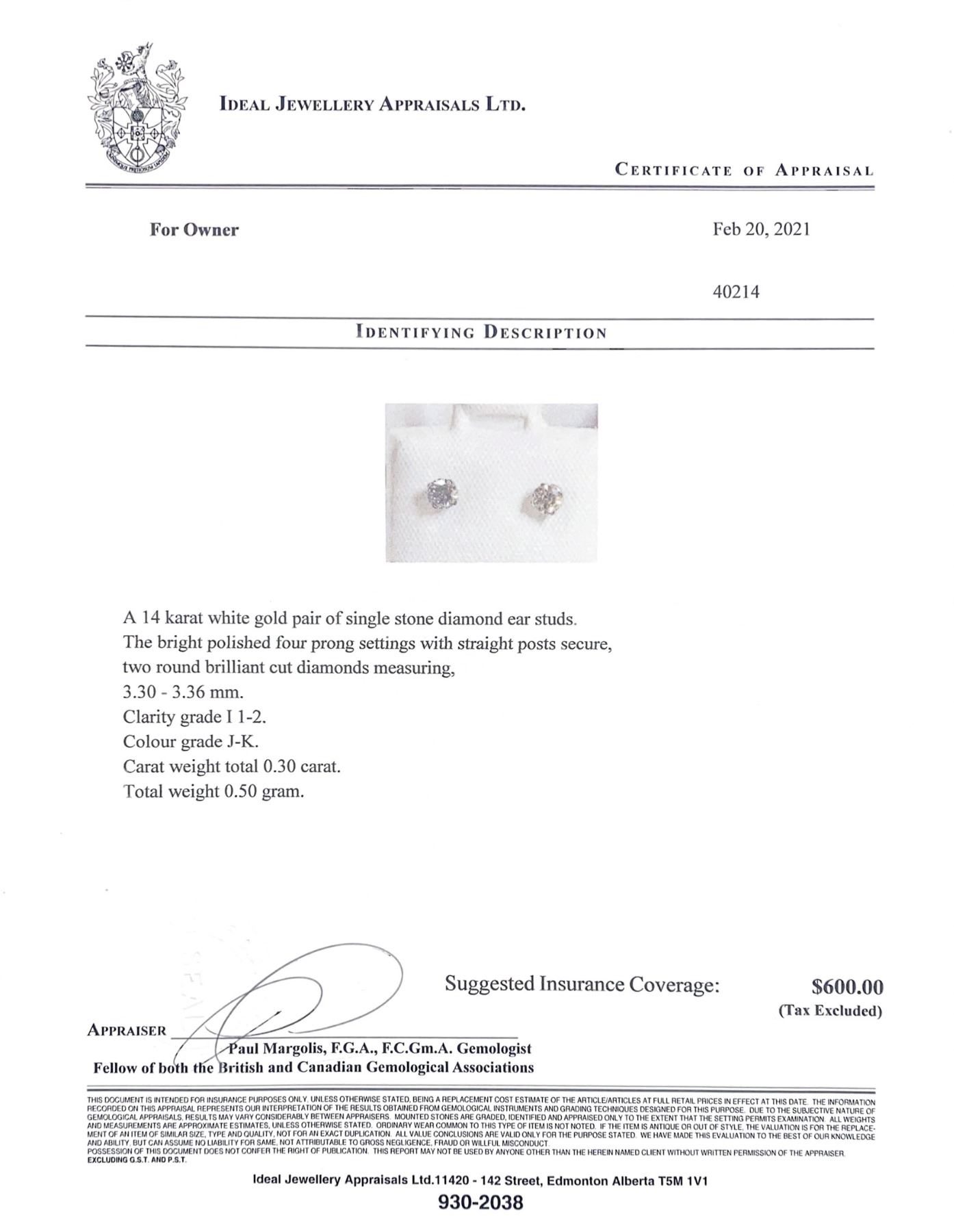 A 14 KARAT WHITE GOLD PAIR OF SINGLE STONE DIAMOND EAR STUDS. THE BRIGHT POLISHED FOUR PRONG SETTINGS WITH STRAIGHT POSTS SECURE, TWO ROUND BRILLIANT CUT DIAMONDS MEASURING,3.30-3.36 MM. CLARITY GRADE I 1-2. COLOUR GRADE J-K. CARAT WEIGHT TOTAL 0.30 CARAT. TOTAL WEIGHT 0.50 GRAM.CERTIFICATE OF APPRAISAL FROM LOCAL APPRAISER, SUGGESTED INSURANCE COVERAGE $600.00.