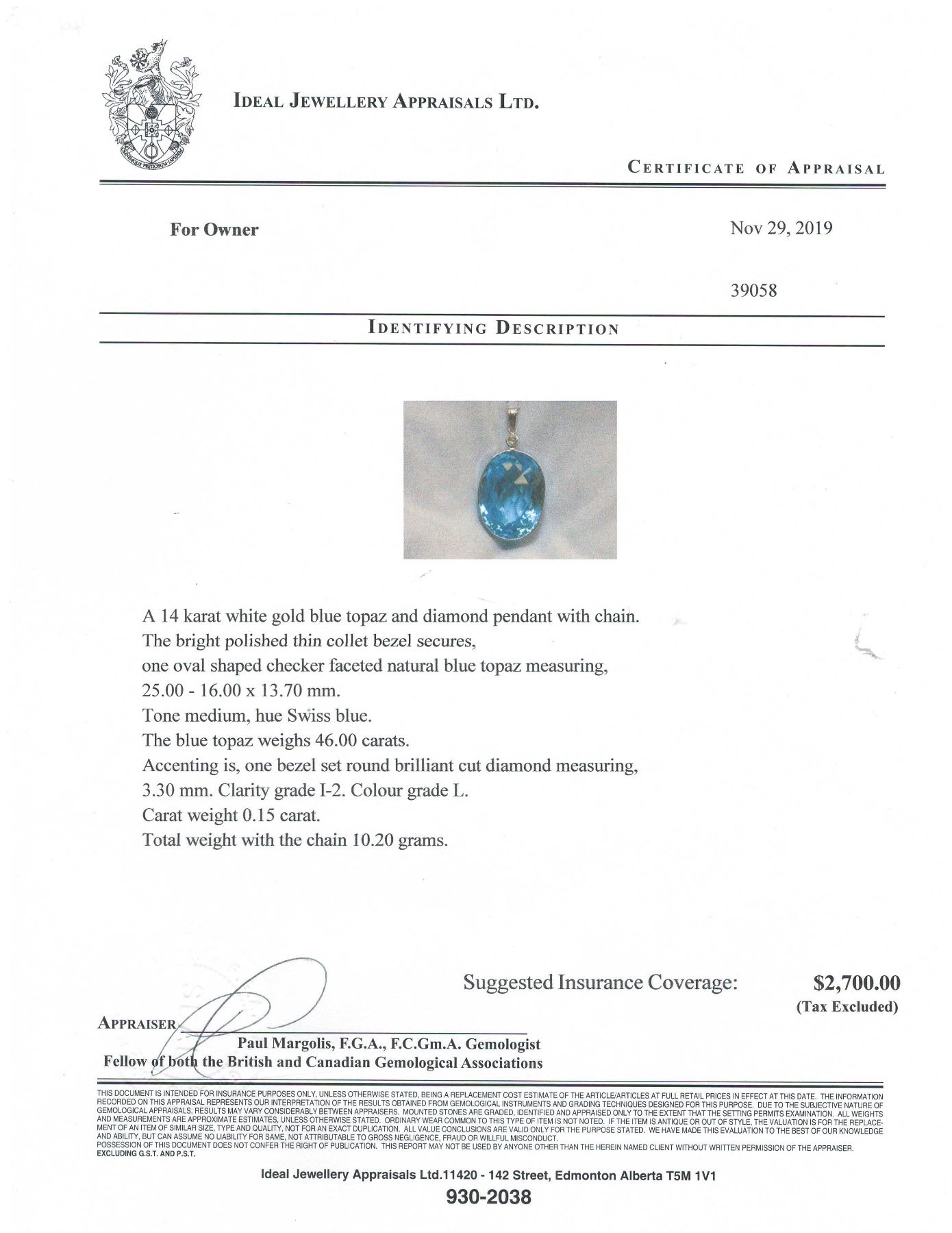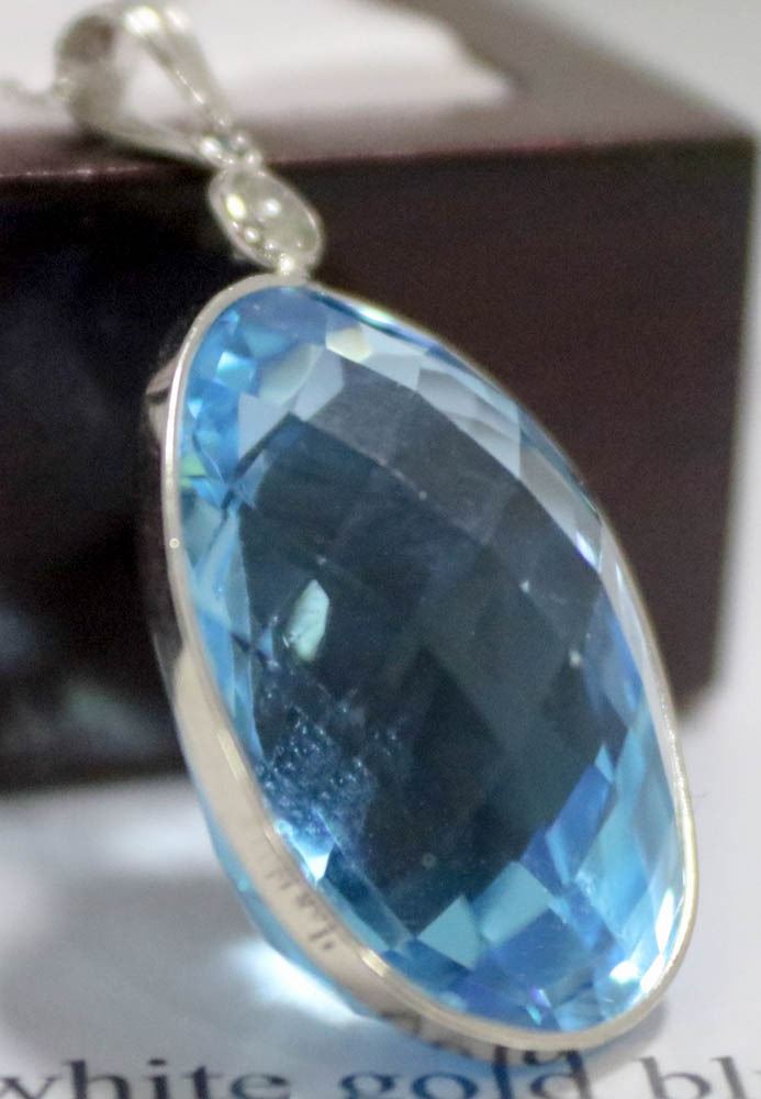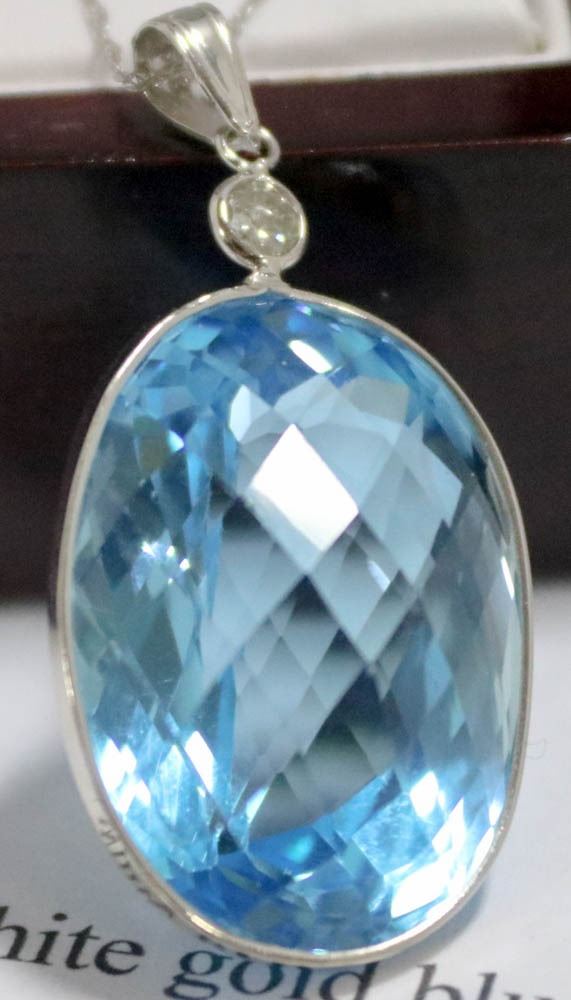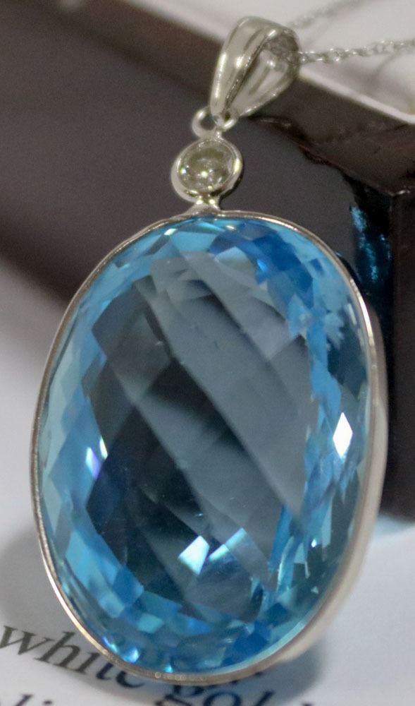 AND LOCAL APPRAISAL, ONE OVAL SHAPED CHECKER FAUCETED NATURAL BLUE TOPAZ, CARAT WEIGHT 46.00 CARATS, ONE BEZEL SET ROUND BRILLIANT CUT DIAMOND, CLARITY GRADED I-2, COLOR GRADE L, CARAT WEIGHT 0.15 CARATS, TOTAL WEIGHT WITH THE CAHIN IS 10.20GRAMS. SUGGESTED INSURANCE COVERAGE $2,700.00. JEWELLERY.