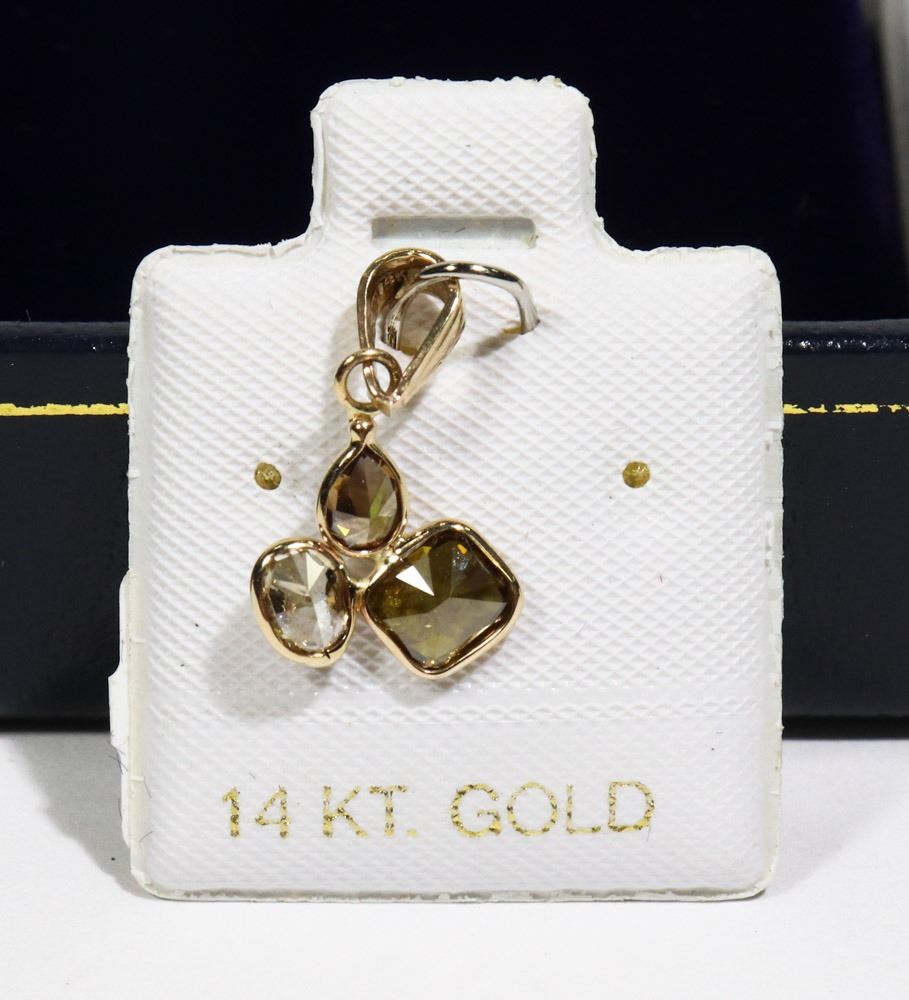 PENDANT. THE RANDOMLY ARRANGED FULL BEZEL DESIGN PENDANT SECURES ONE CUSHION, OVAL AND PEAR SHAPED DIAMONDS (MEASURING TO 6.5.00 - 4.20 X 2.07 MM, HUES BROWN AND BROWNISH/GREEN, CLARITY GRADES I 1-2, TOTAL DIAMOND WEIGHT 0.70 CARAT.) COMES WITHCERTIFICATE OF APPRAISAL FROM LOCALAPPRAISER,SUGGESTED INSURANCE COVERAGE $1600.00. JEWELLERY