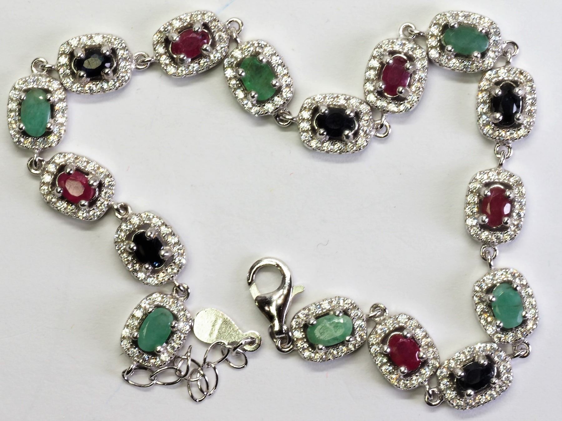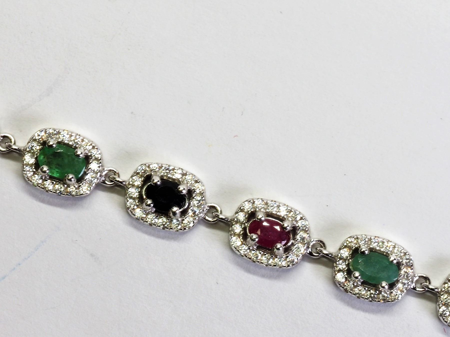 44-SG16- STERLING SILVER RUBY EMERALD SAPPHIRE CZ BRACELET (APP.12G). JEWELRY