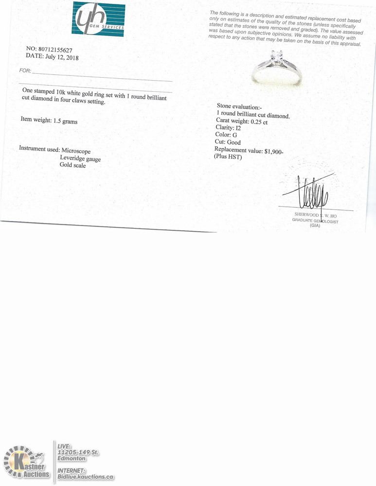 95-LS112 - 10KT WHITE GOLD DIAMOND (0.25CT) RING (SIZE 6). SUGGESTED REPLACEMENT VALUE $1900.00. JEWELLERY