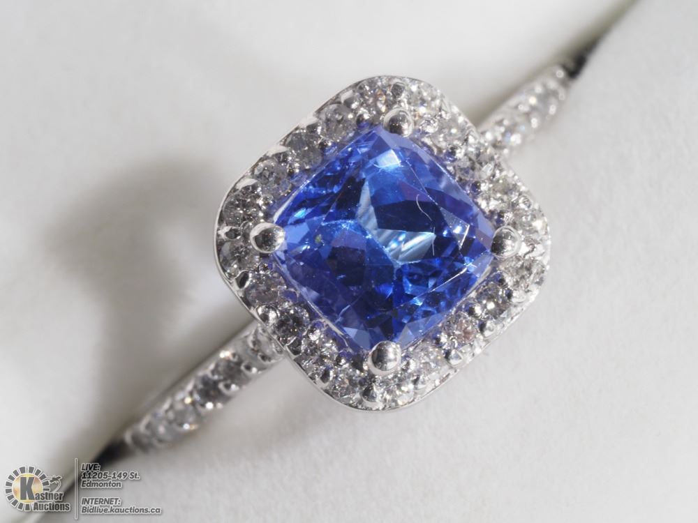 45-LS34- 10KT WHITE GOLD TANZANITE (1.10CT) AND 34 DIAMONDS (0.34CT) RING SIZE 6.25 IN HALO DESIGN W/COA. SUGGESTED RETAIL VALUE $3300.00. JEWELLERY