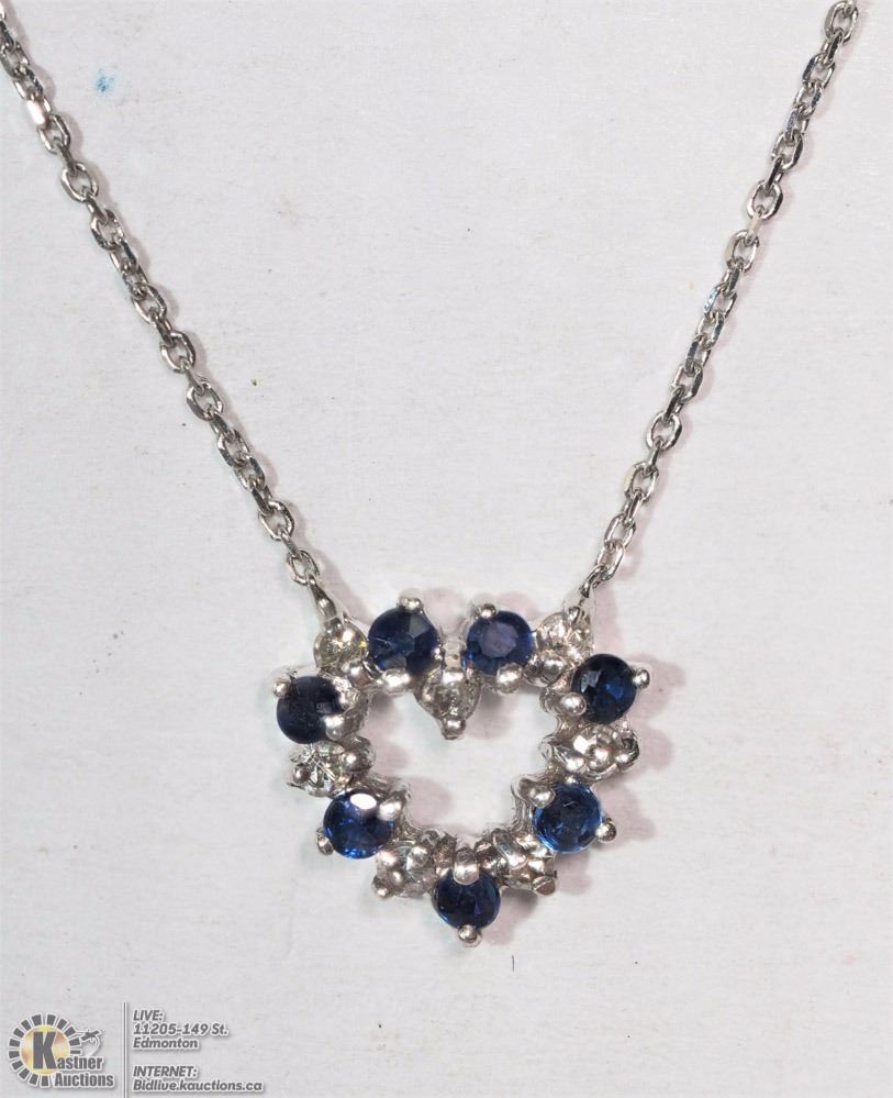 (8-NT-45)14K WHITE GOLD SAPPHIRE AND DIAMOND HEART NECKLACE. MSRP $1050.00