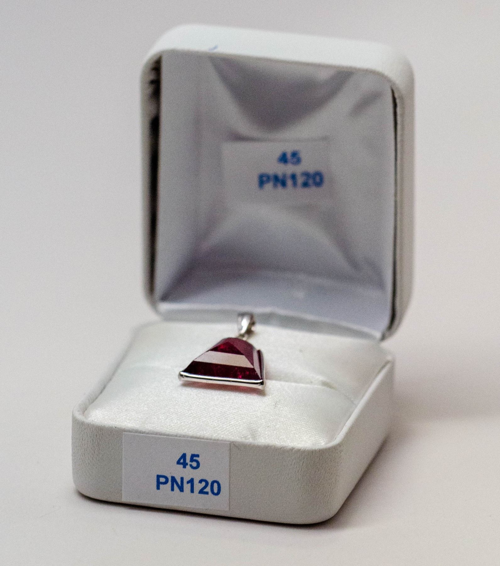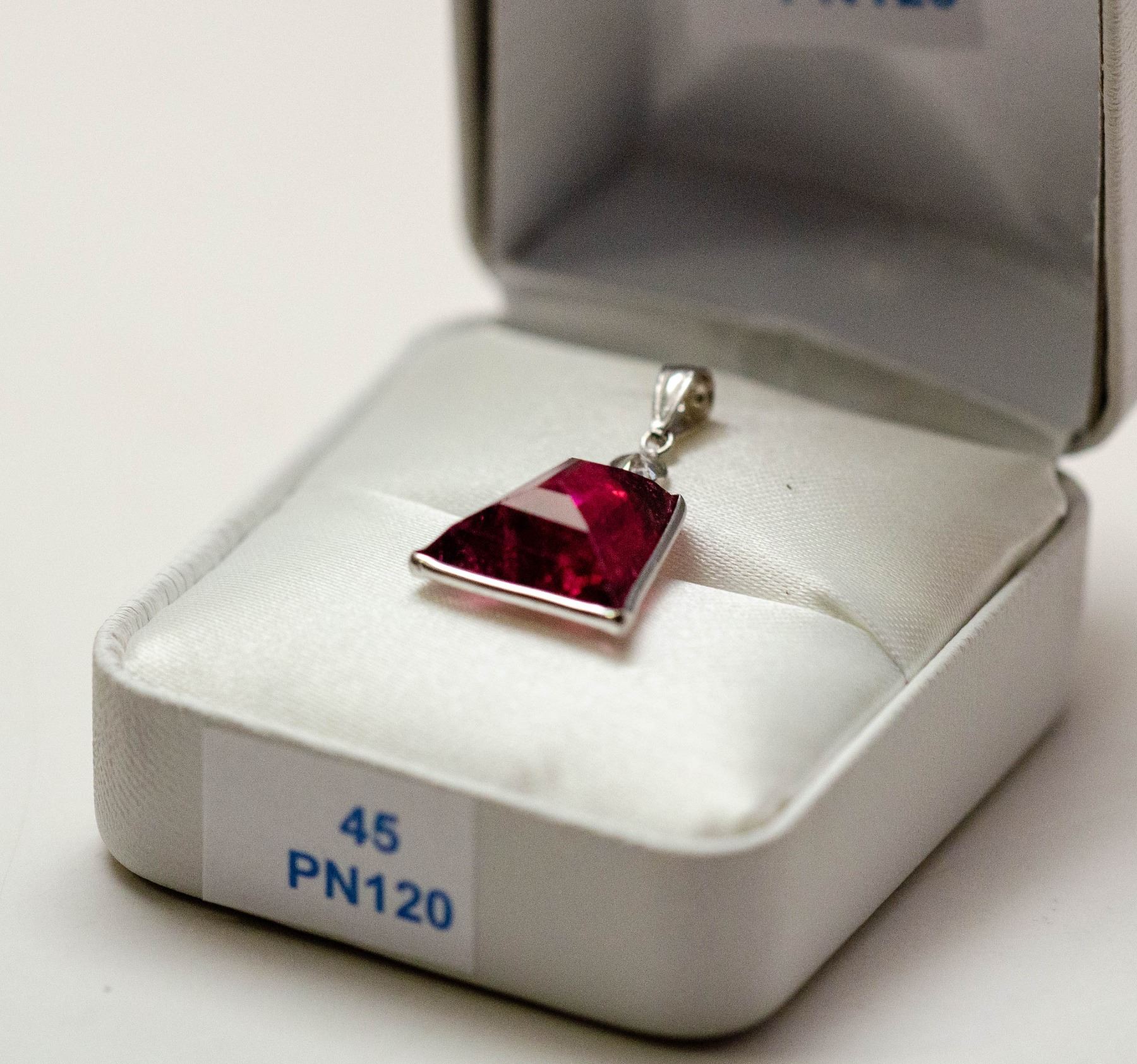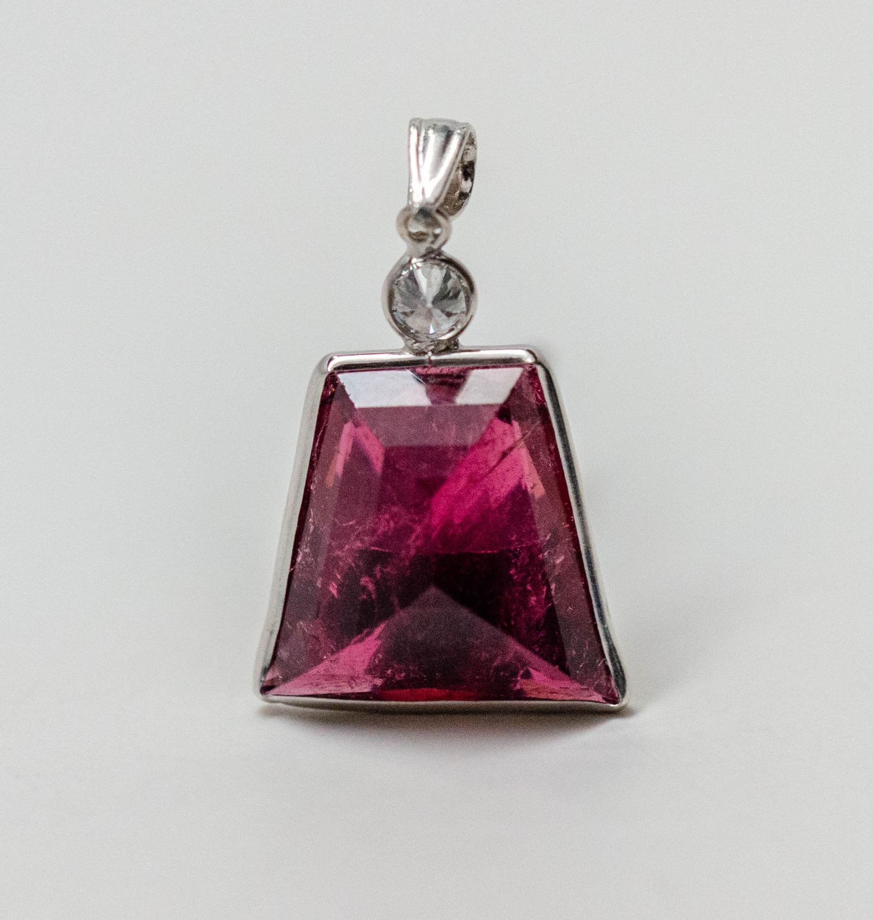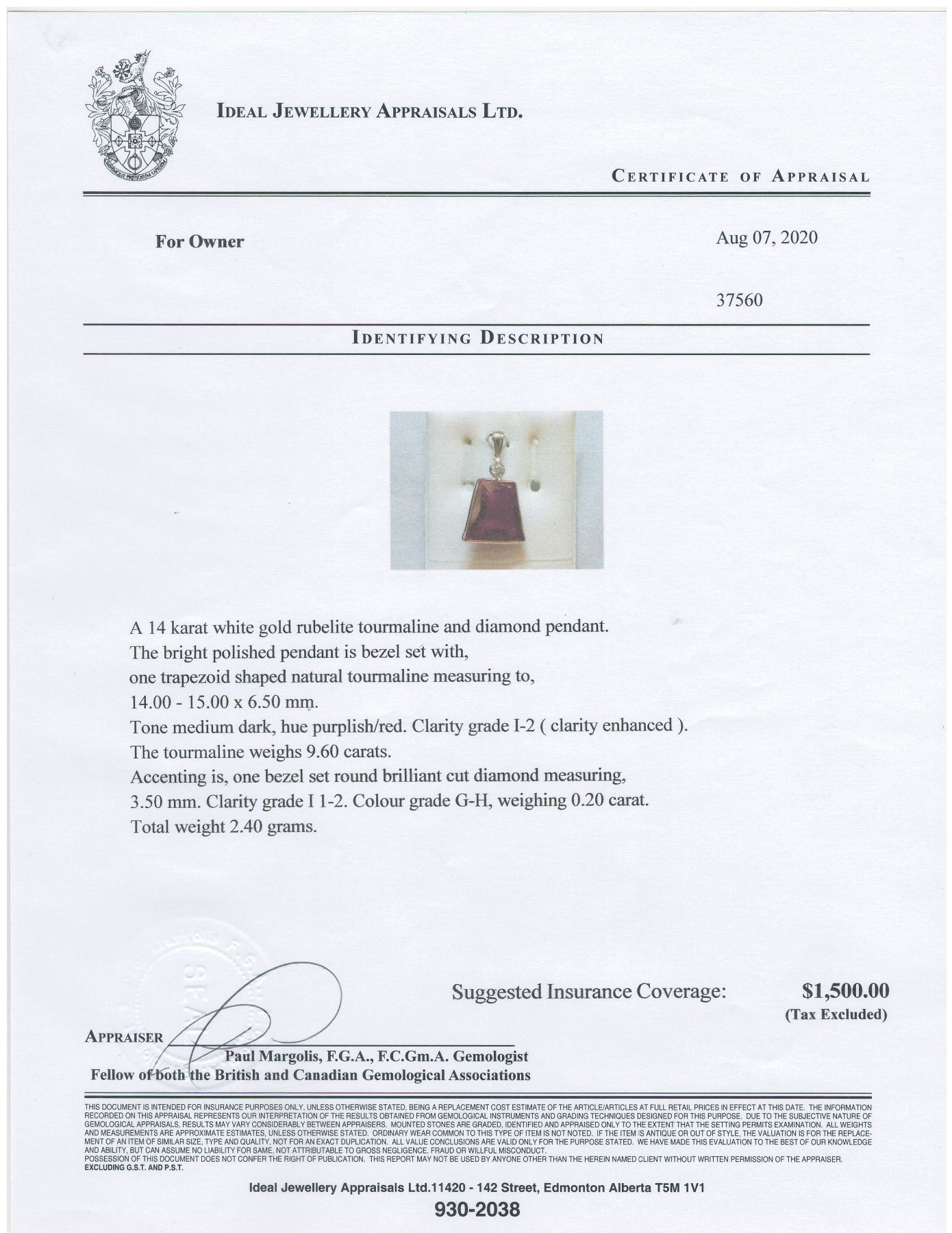 PENDANT. THE BRIGHT POLISHED PENDANT IS BEZEL SET WITH ONE TRAPEZOID SHAPED NATURAL TOURMALINE (MEASURING 14.00 - 15.00 X 6.50 MM, TONE MEDIUM DARK, HUE PURPLISH/RED, CLARITY GRADE I-2 ( CLARITY ENHANCED ).THE TOURMALINE WEIGHS 9.60 CARATS.) ACCENTING IS ONE BEZEL SET ROUND BRILLIANT CUT DIAMOND (MEASURING 3.50 MM, CLARITY GRADE I 1-2, COLOUR GRADE G-H, WEIGHING 0.20 CARAT) COMES WITH CERTIFICATE OF APPRAISAL FROM LOCAL APPRAISER,SUGGESTED INSURANCE COVERAGE $1500.00. JEWELLERY .