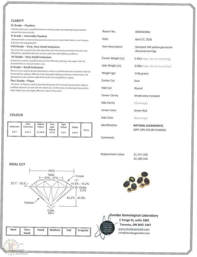 14KT YELLOW ALEXANDRITE (2.40CT) & DIAMOND EARRINGS W/ COA - SUGGESTED REPLACEMENT VALUE $2,189.00