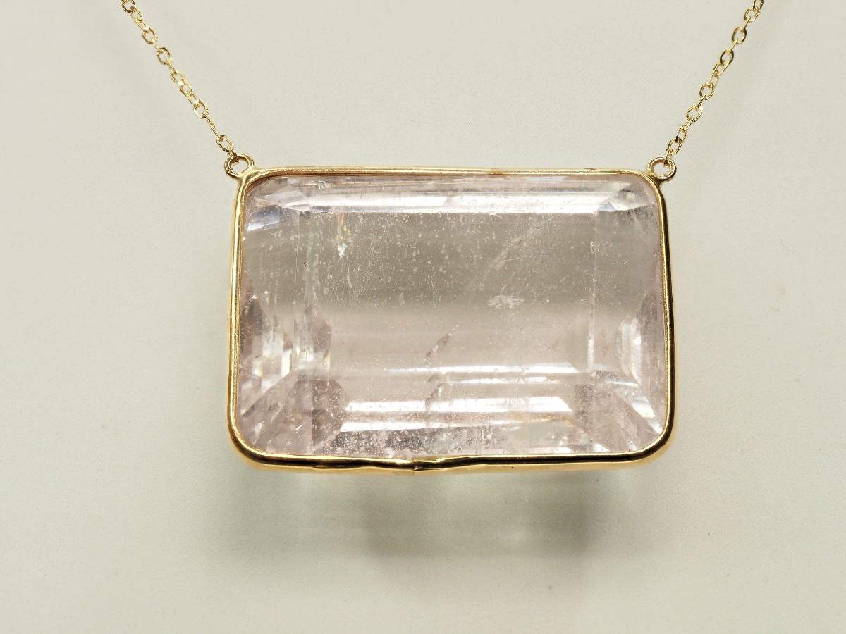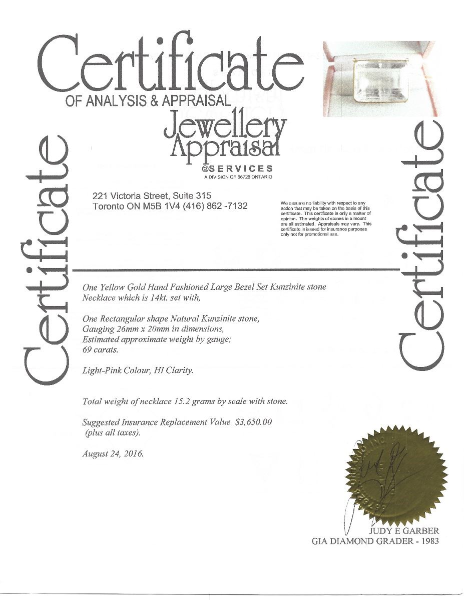 14K YELLOW GOLD LARGE KUNZITE(69.0CT) NECKLACE. W/ COA - SUGGESTED REPLACEMENT VALUE $3,650.00