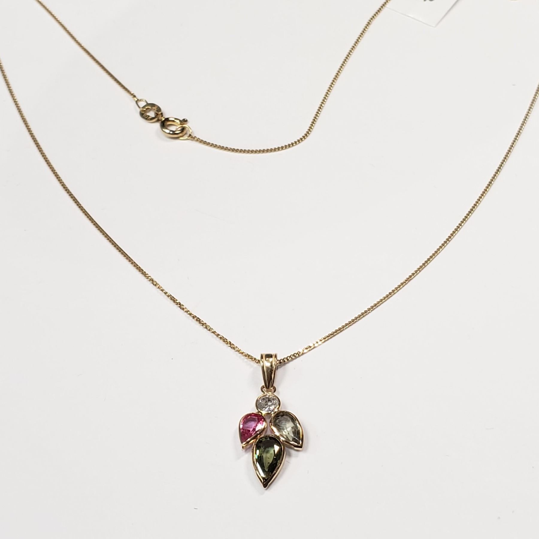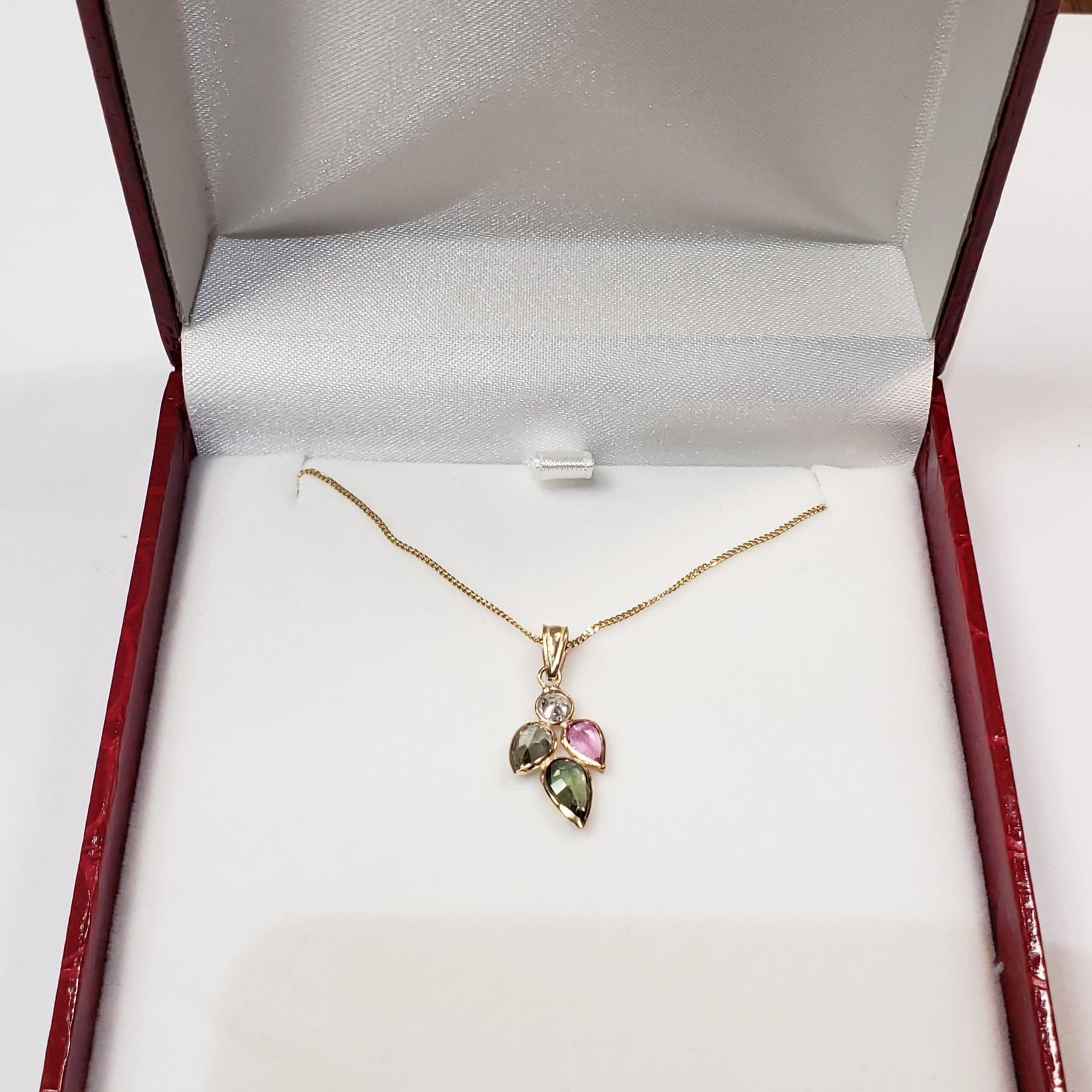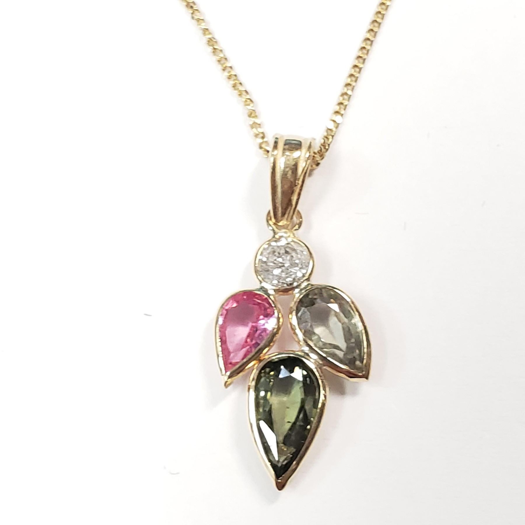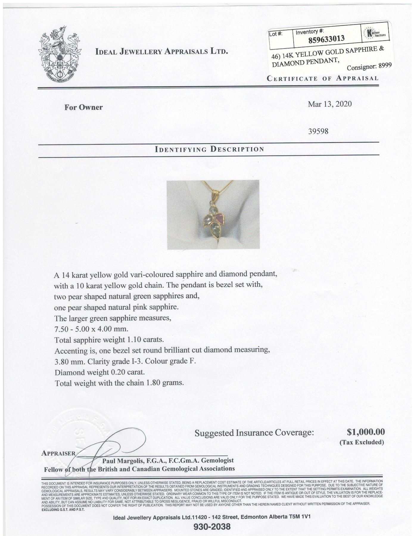 WITH 10K YELLOW GOLD CHAIN, TWO PEAR SHAPED GREEN SAPPHIRES & ONE PEAR SHAPED PINK SAPPHIRE, LARGER GREEN SAPPHIRE MEASURES 7.50-5.00 X 4.00MM, TOTAL SAPPHIRE WEIGHING 1.10 CARATS, ONE DIAMOND (MEASURING 3.80MM, CLARITY GRADE I-3, COLOR GRADE F, DIAMOND WEIGHT 0.20 CARATS). COMES WITH CERTIFICATE OF APPRAISAL FROM LOCAL APPRAISER. SUGGESTED INSURANCE COVERAGE $1,000.00. JEWELLERY