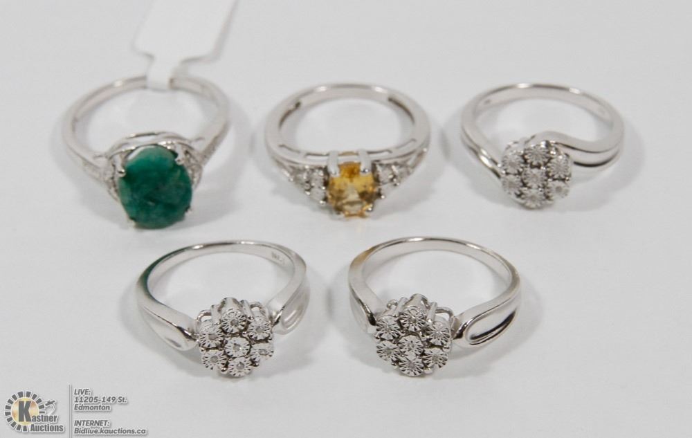 46 - BA29- LOT OF 5 STERLING SILVER DIAMOND,CITRINE AND EMERALD RINGS. JEWELLERY.