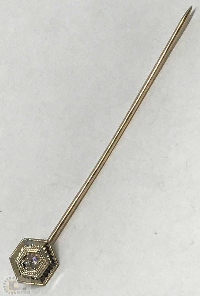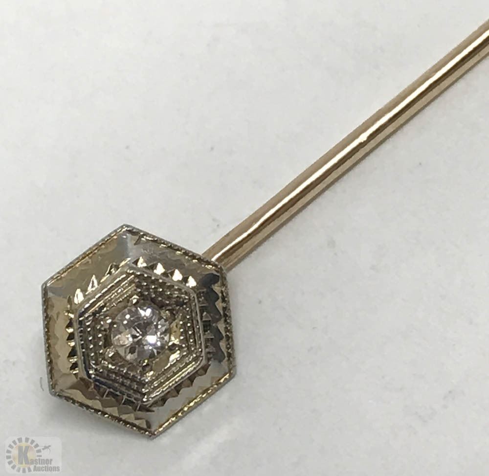 14K YELLOW GOLD DIAMOND(0.10CT) ANTIQUE VICTORIAN STYLE SOLITAIRE DIAMOND STICK PIN. W/ COA - SUGGESTED REPLACEMENT VALUE $750.00