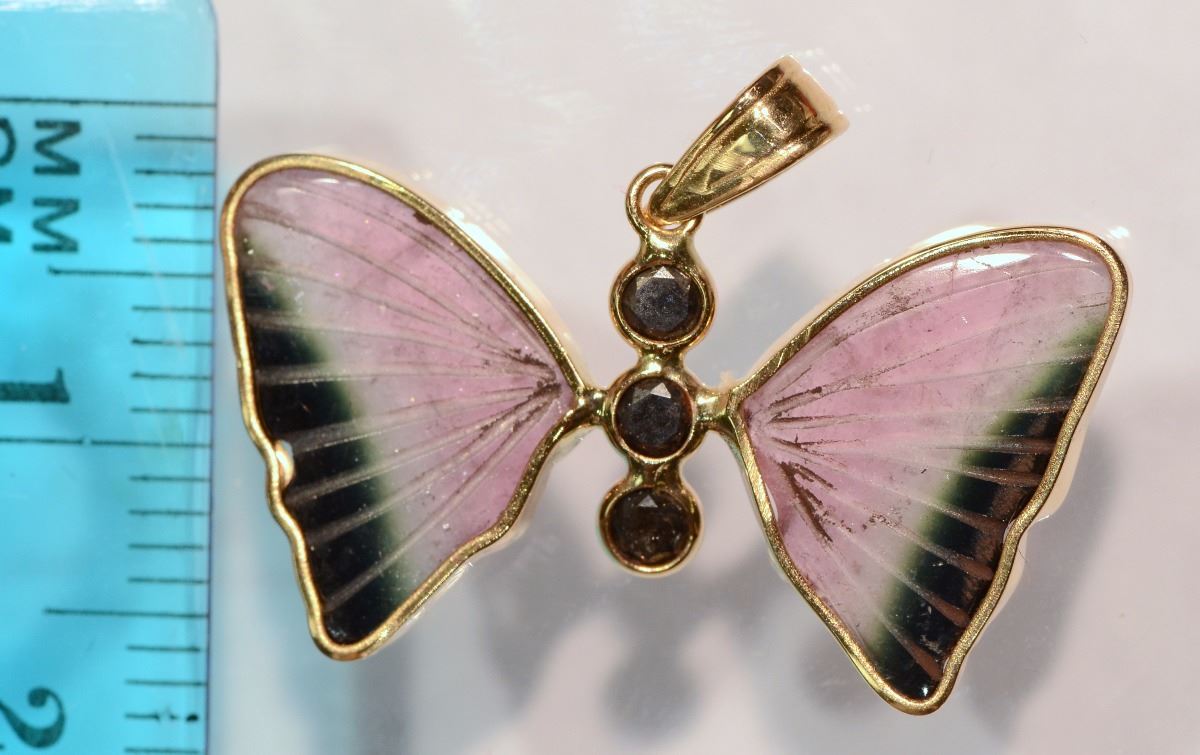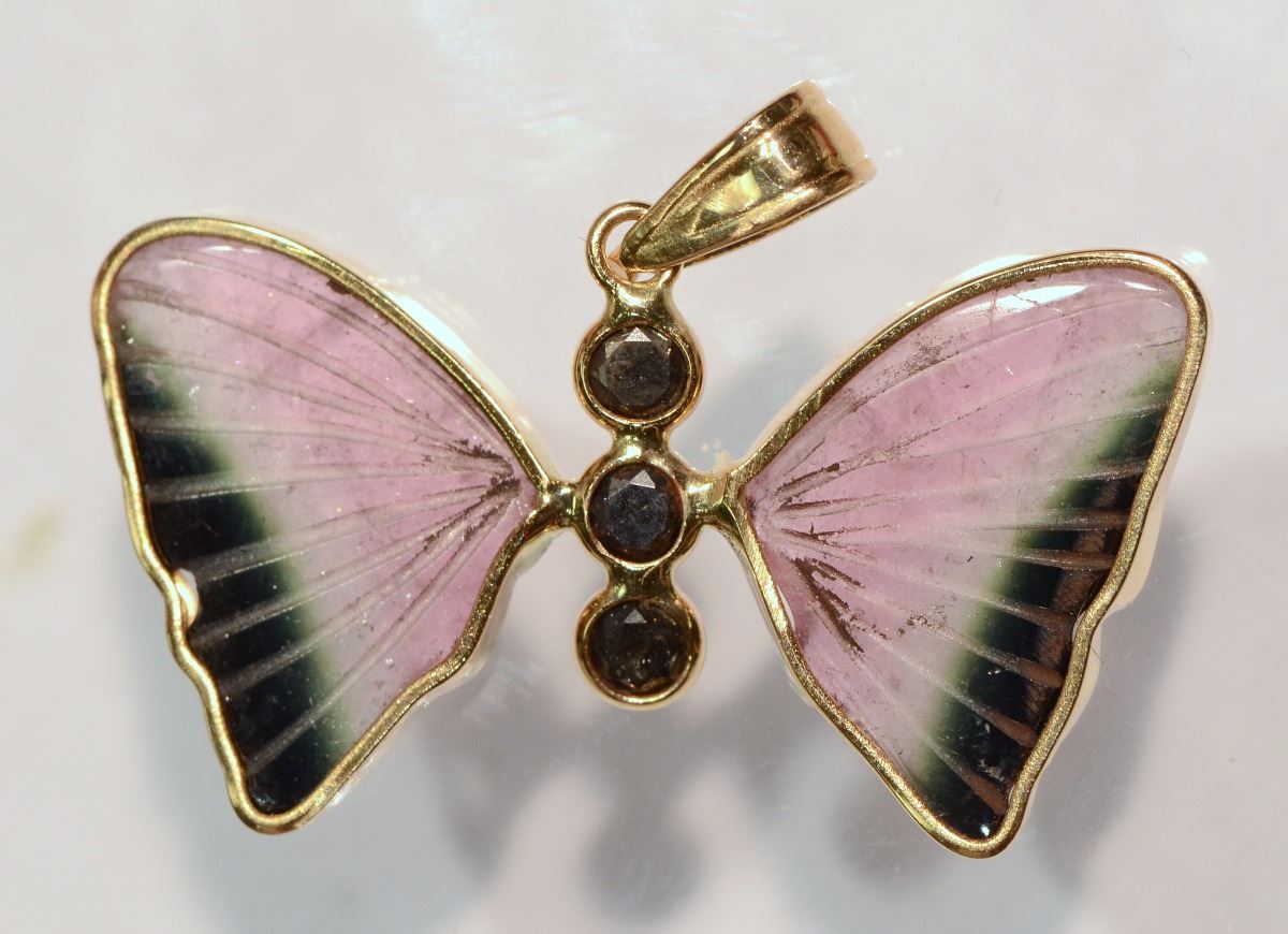 HAND ENGRAVED WATERMELON TOURMALINE (5.10CT) & 3 BLACK DIAMONDS (0.30CT) - COMES WITH COA SUGGESTED REPLACEMENT VALUE $2250