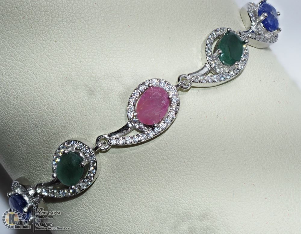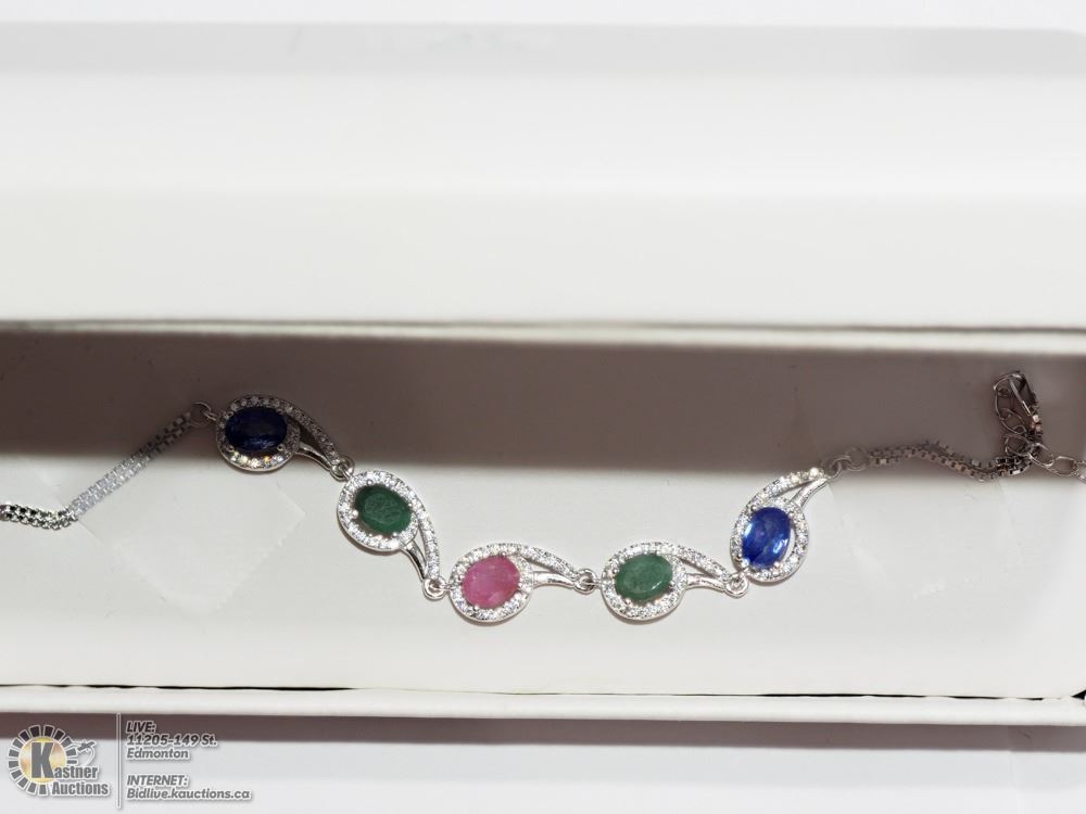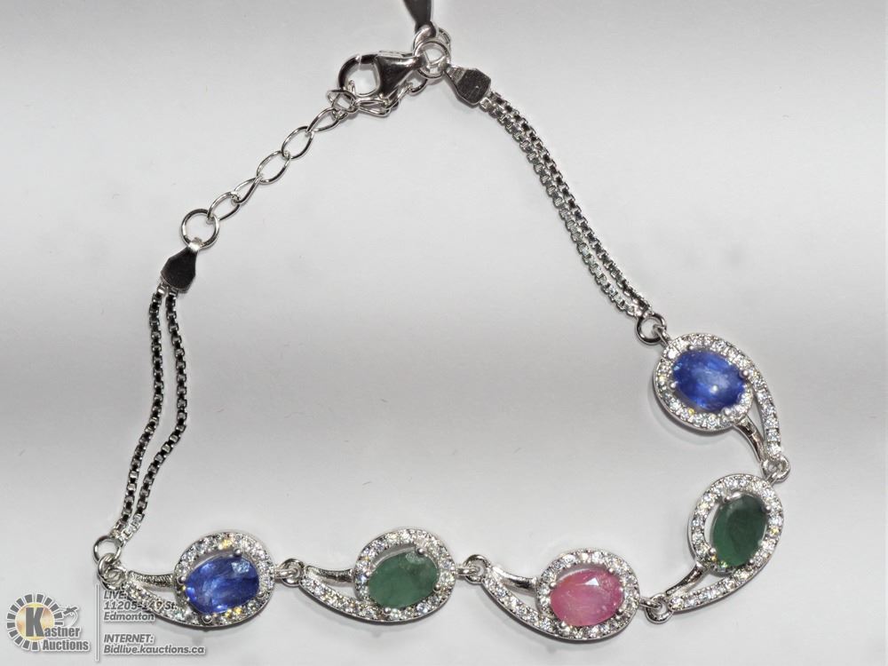 47-BA33A- STERLING SILVER RUBY,SAPPHIRE ,EMERALD AND CZ BRACELET. JEWELRY.