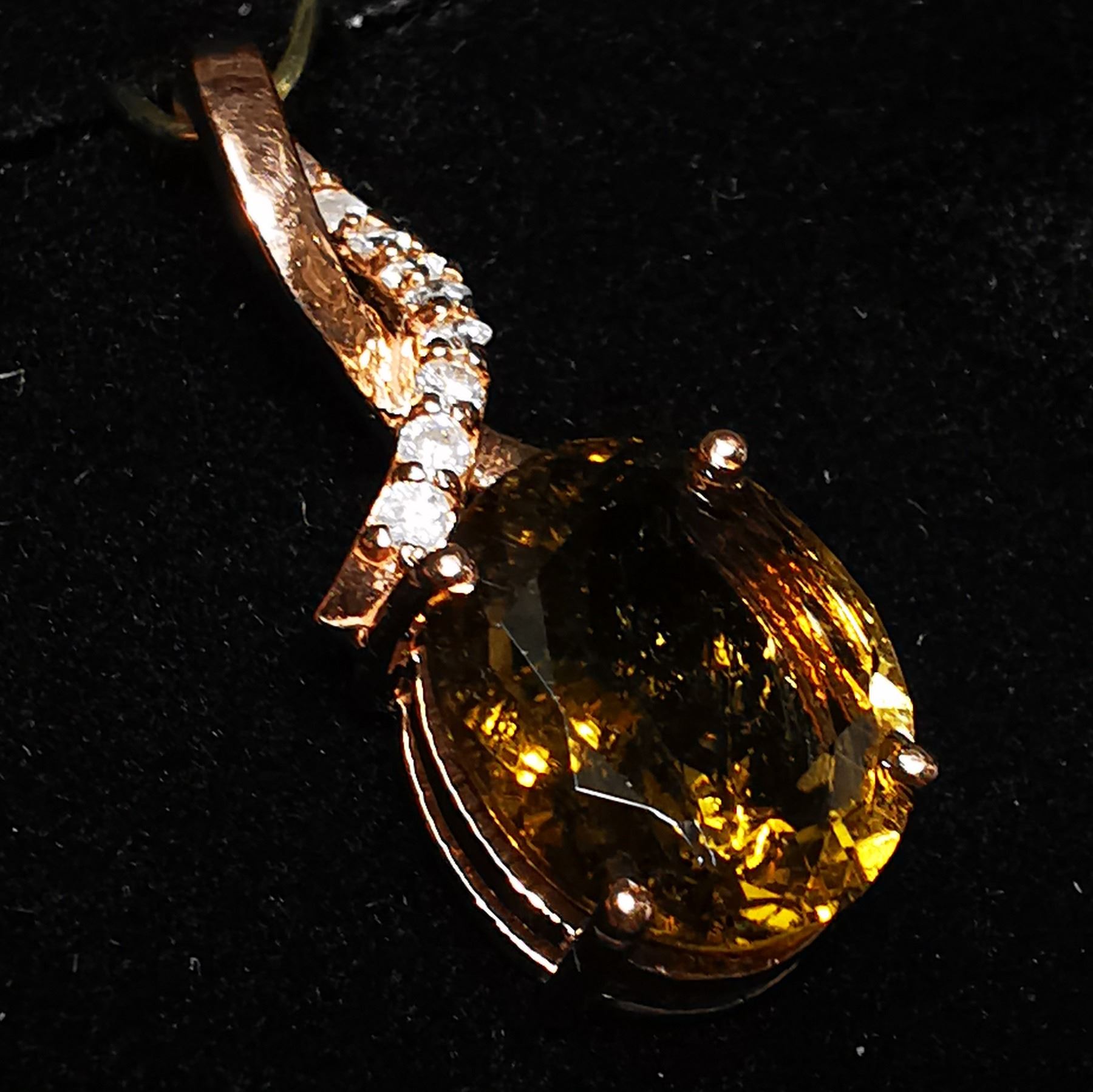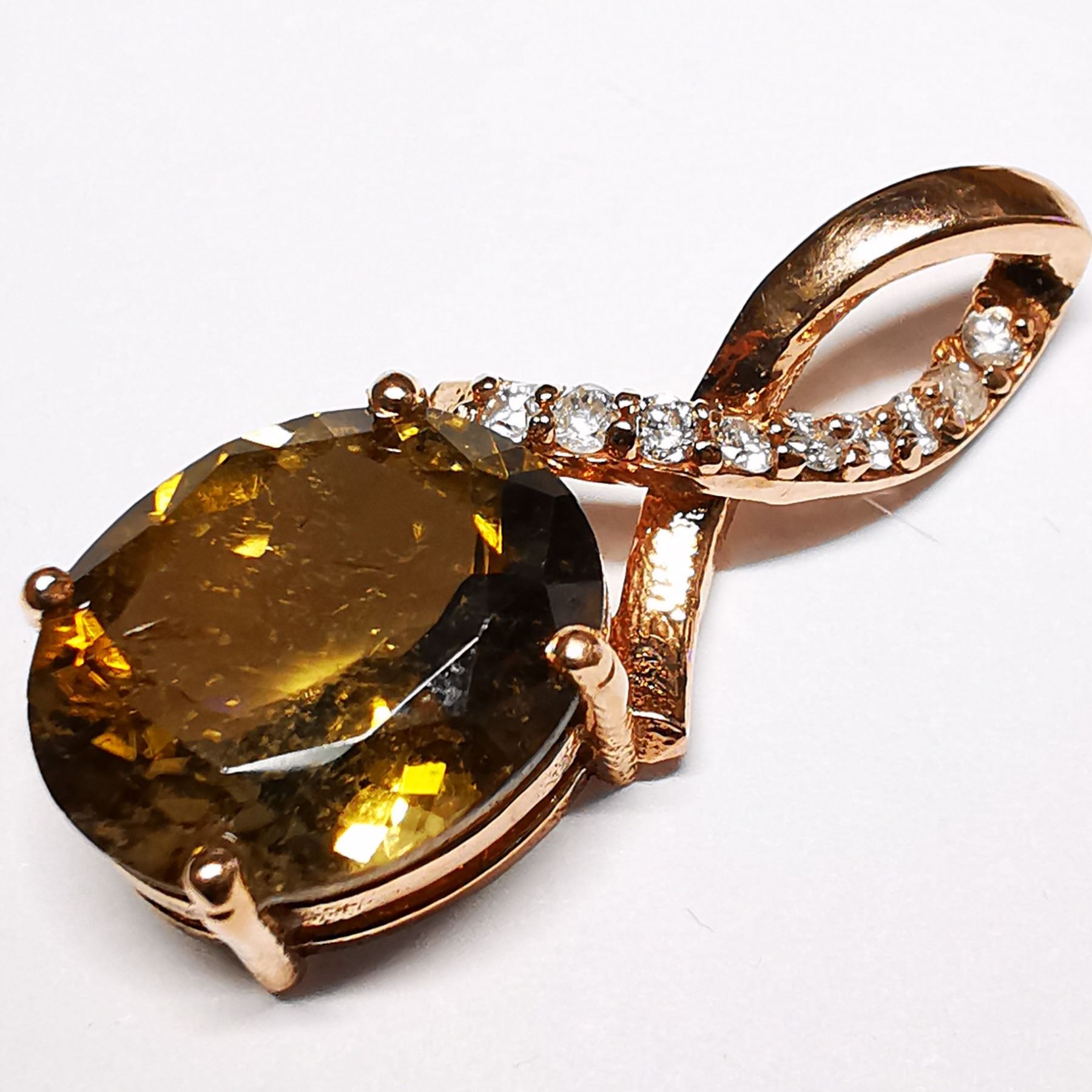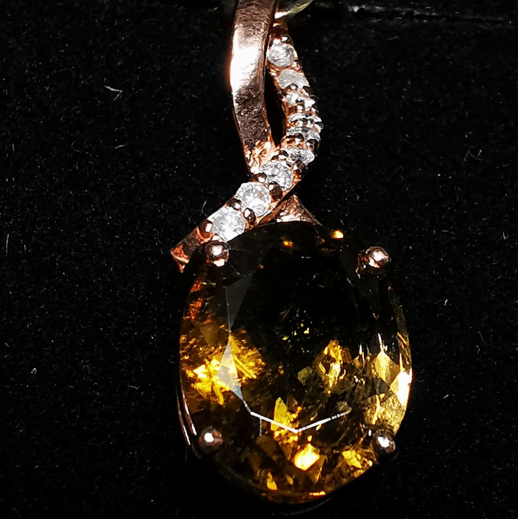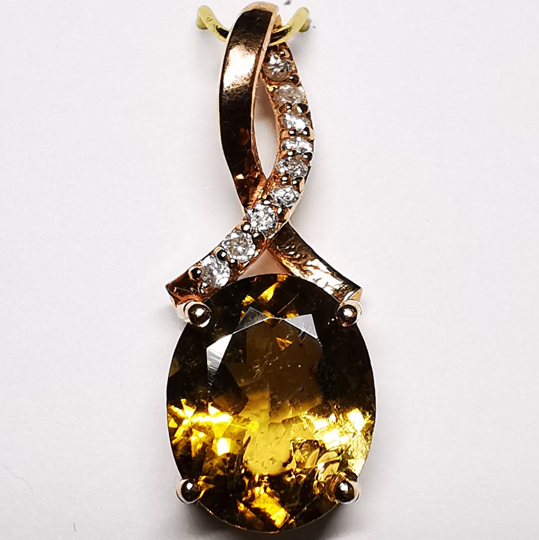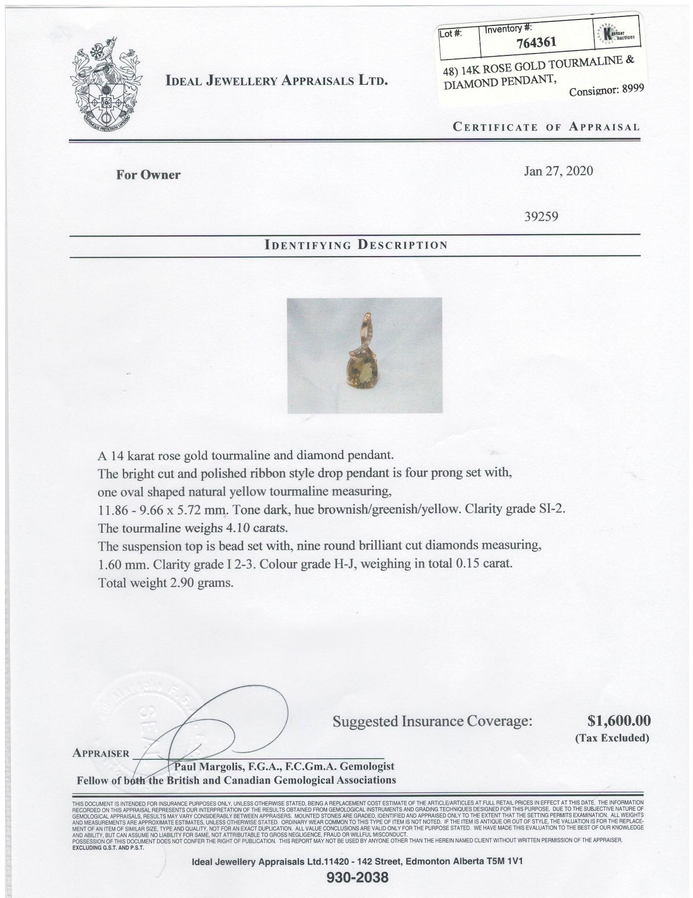 ONE OVAL SHAPED NATURAL YELLOW TOURMALINE (MEASURING 11.86 - 9.66 X 5.72 MM, TONE DARK, HUE BROWNISH/GREENISH/YELLOW, CLARITY GRADE SI-2, WEIGHING 4.10 CARATS), NINE ROUND BRILLIANT CUT DIAMONDS (MEASURING 1.60 MM, CLARITY GRADE I 2-3,COLOR GRADE H-J, WEIGHING 0.15 CARATS). COMES WITH CERTIFICATE OF APPRAISAL FROM LOCAL APPRAISER, SUGGESTED INSURANCE COVERAGE $1600.00. JEWELLERY