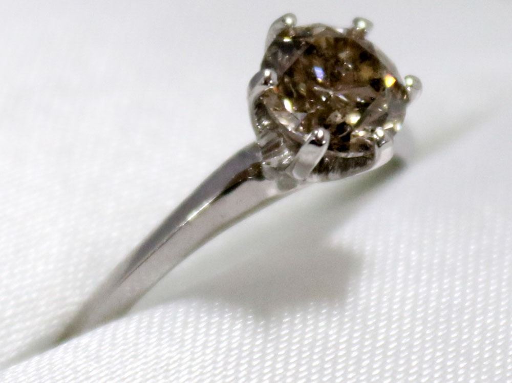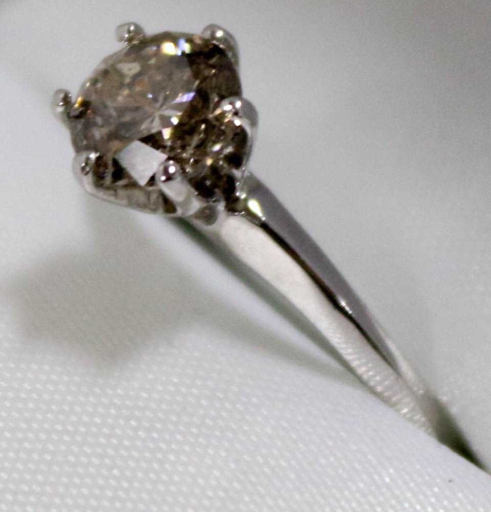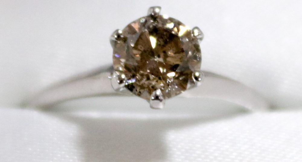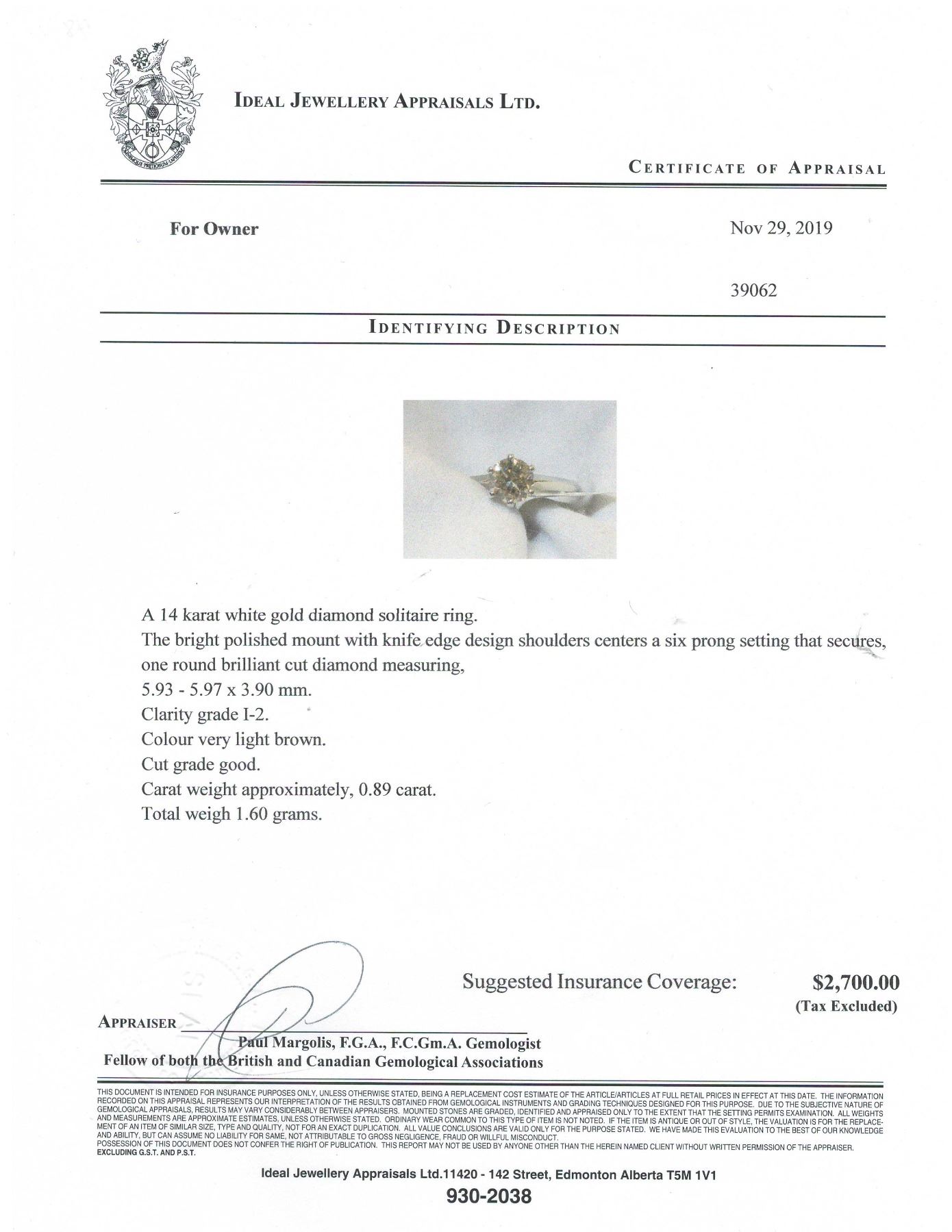 SIZE 5.5 WITH LOCAL APPRAISAL, ONE ROUND BRILLIANT CUT DIAMOND, CLARITY GRADE I-2, COLOR VERY LIGHT BROWN, CUT GRADE GOOD, CARAT WEIGHT 0.89 CARATS, TOTAL WEIGHT 1.60 GRAMS. SUGGESTED INSURANCE COVERAGE $2,700.00. JEWELLERY.