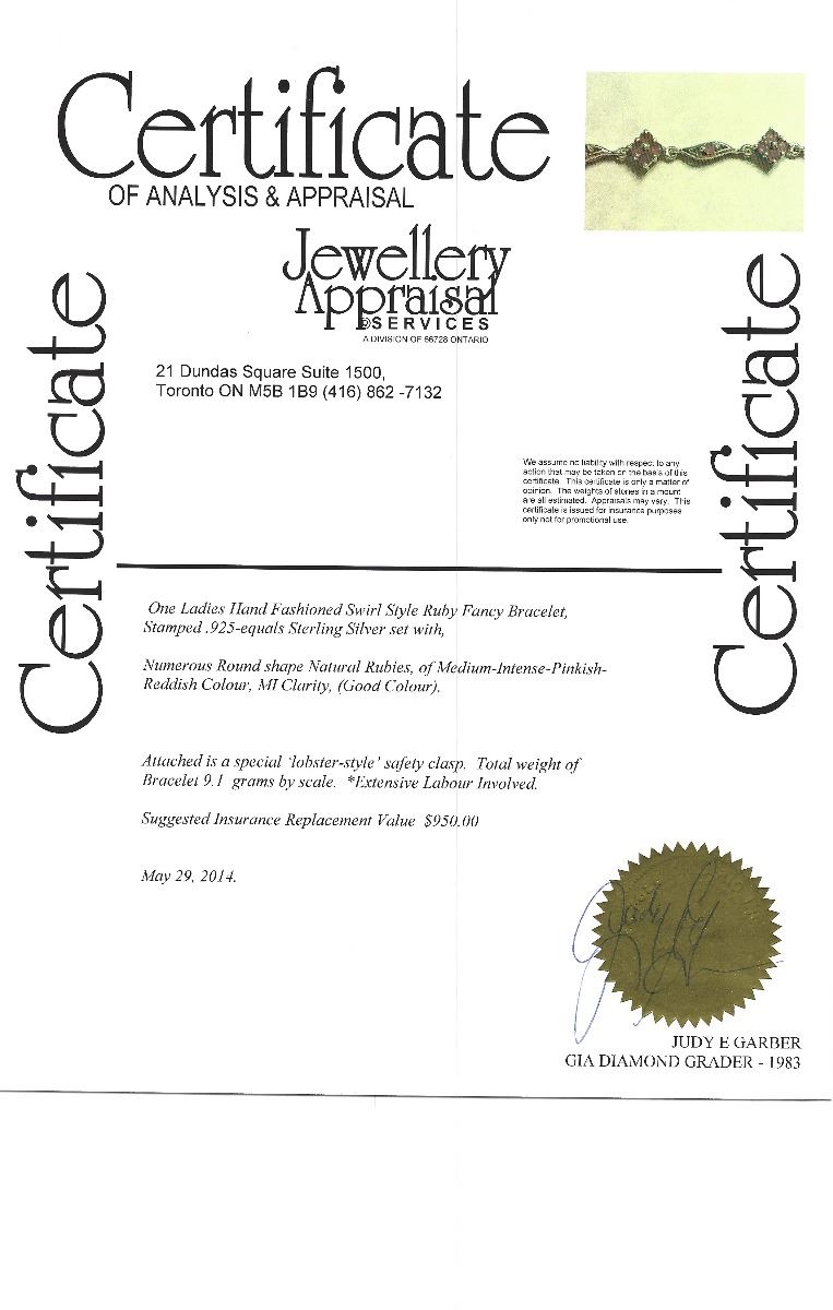 STERLING SILVER RUBY BRACELET. W/ COA- SUGGESTED REPLACEMENT VALUE $950.00